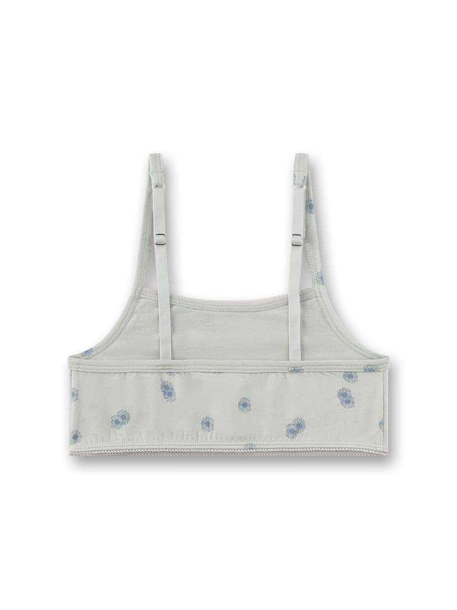 Дизайн вирізняється делікатною естетикою. Світлий відтінок доповнений дрібним квітковим принтом у ніжному блакитному кольорі. Такий візерунок створює свіжий, витончений образ. Тонкі регульовані бретелі дозволяють налаштувати посадку для максимального комфорту. Лаконічний крій формує акуратний силует, ідеально підходить для щоденного носіння.