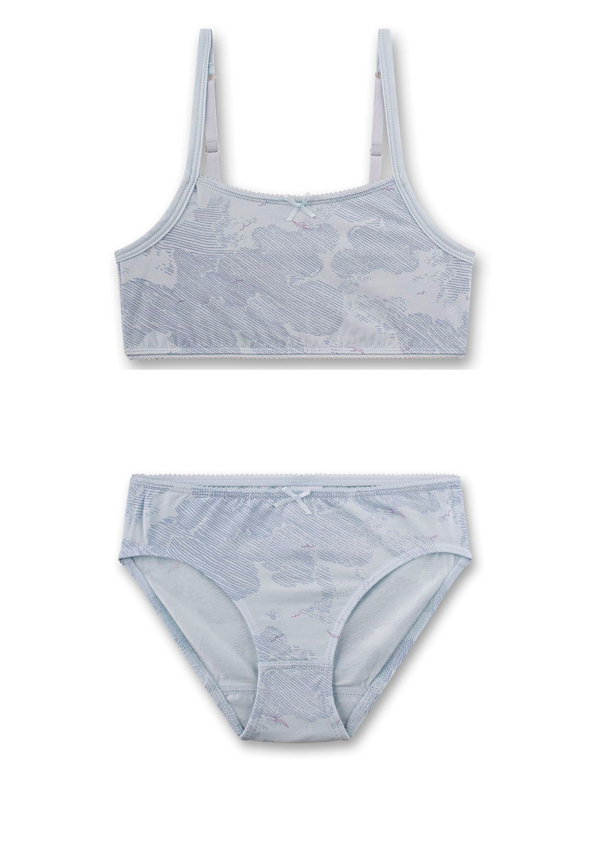 Ніжний візерунок у хмарному стилі та маленький бантик додають моделі витонченості. Топ має м’яку посадку та зручні регульовані бретелі, трусики — еластичний пояс і м’які шви, що не тиснуть. Комплект Sanetta створений для активних днів і спокійного відпочинку, даруючи відчуття легкості та свободи.