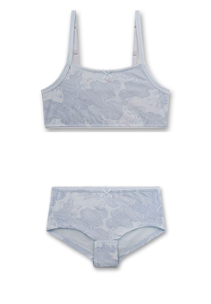 Модель прикрашена делікатним візерунком у хмарному стилі та маленькими бантиками, що додають витонченості. М’які плоскі шви не подразнюють шкіру, а еластичні бретелі забезпечують зручну посадку. Ідеальний вибір для щоденного носіння — стильний, легкий і комфортний комплект від Sanetta.