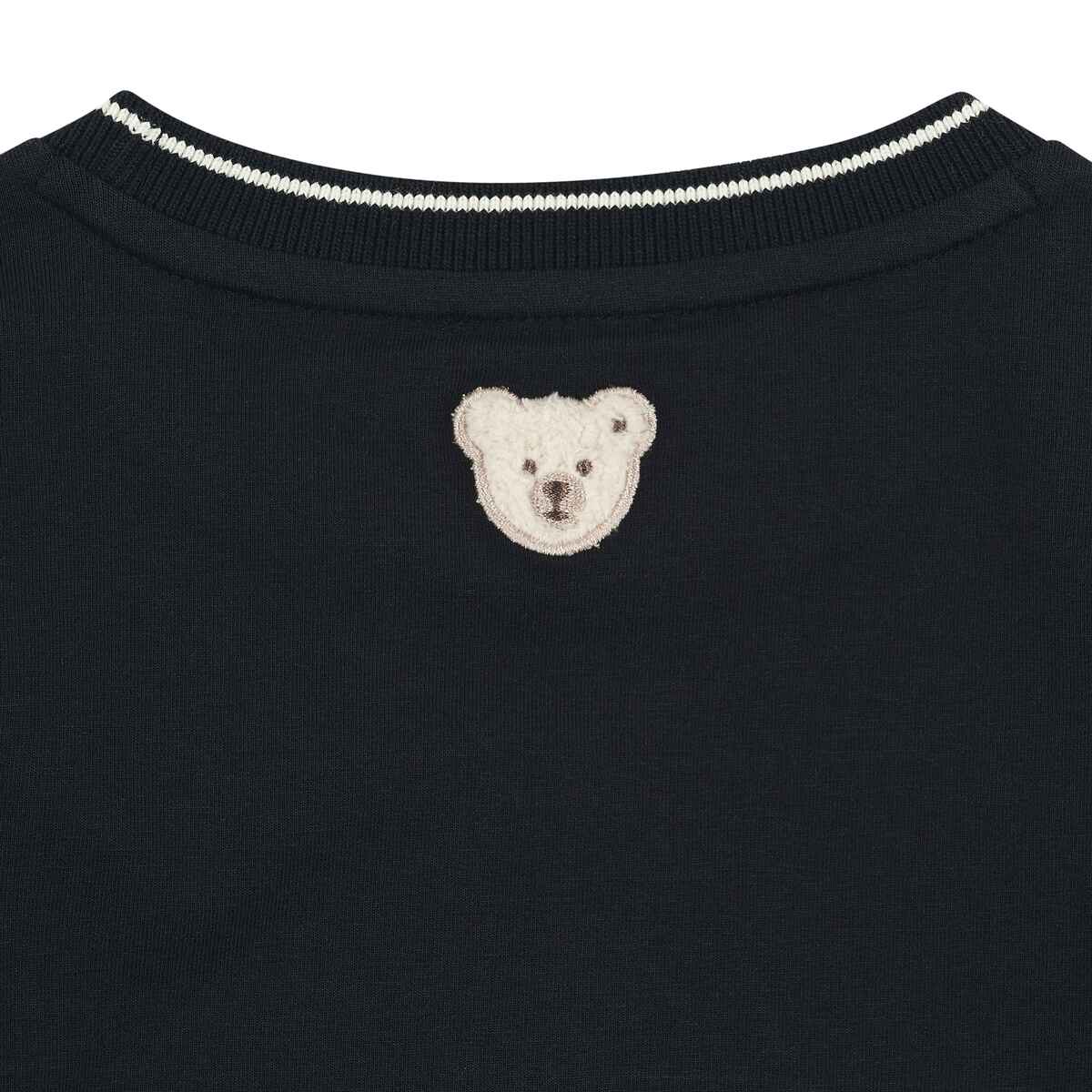 Футболка Celebration з довгім рукавом поєднує комфорт м’якого трикотажу та яскравий спортивний дизайн. Глибокий темно-синій відтінок доповнений контрастними смужками на рукаві та акуратною бейкою на горловині, що створює коледж-настрій. На передній частині виділяється великий принт із веселим ведмедиком Steiff і літерою “S”, додаючи образу динаміки. Класичний ведмедик Steiff на спині завершує дизайн ніжним фірмовим акцентом. М’яка натуральна тканина забезпечує комфорт і свободу рухів — ідеальний вибір на кожен день.