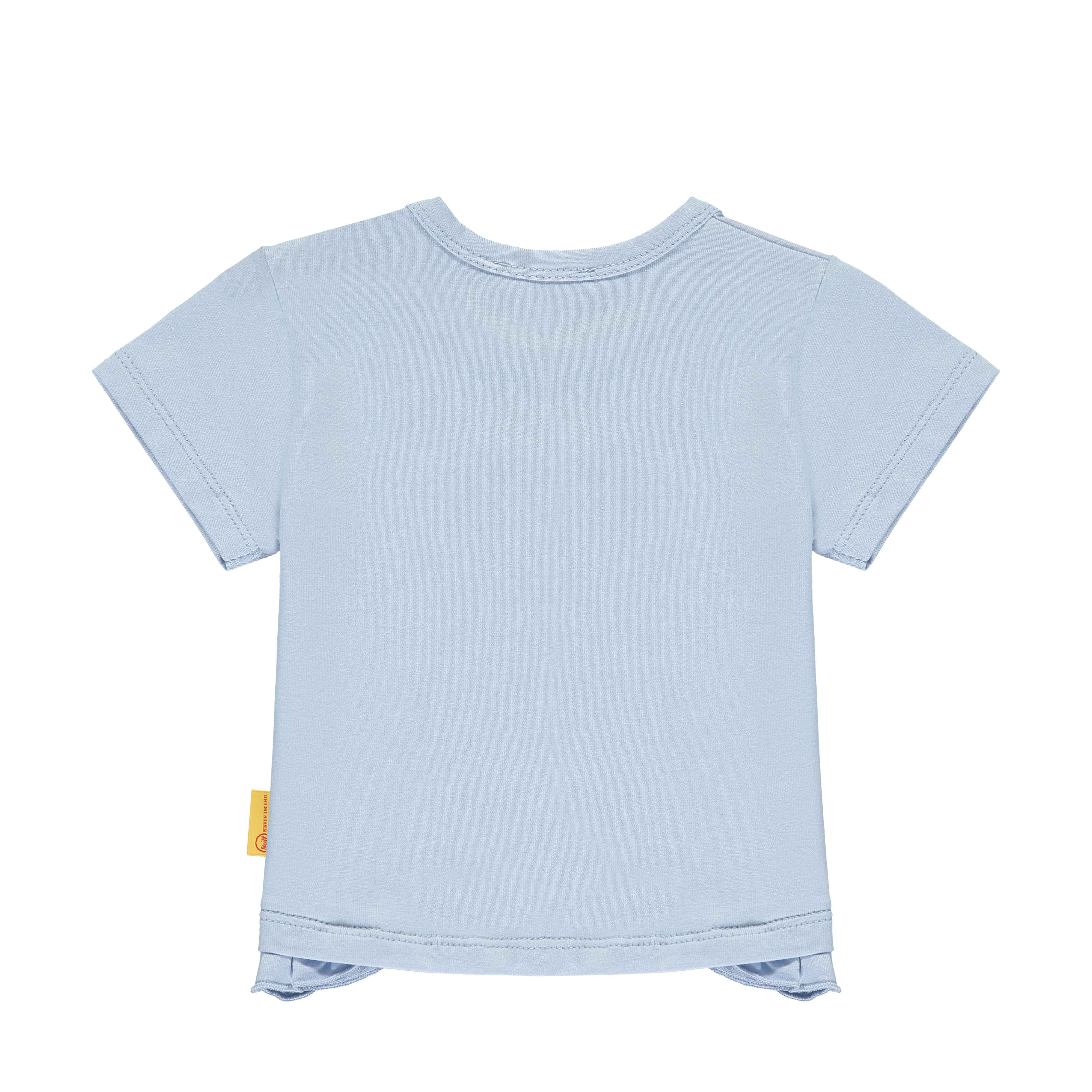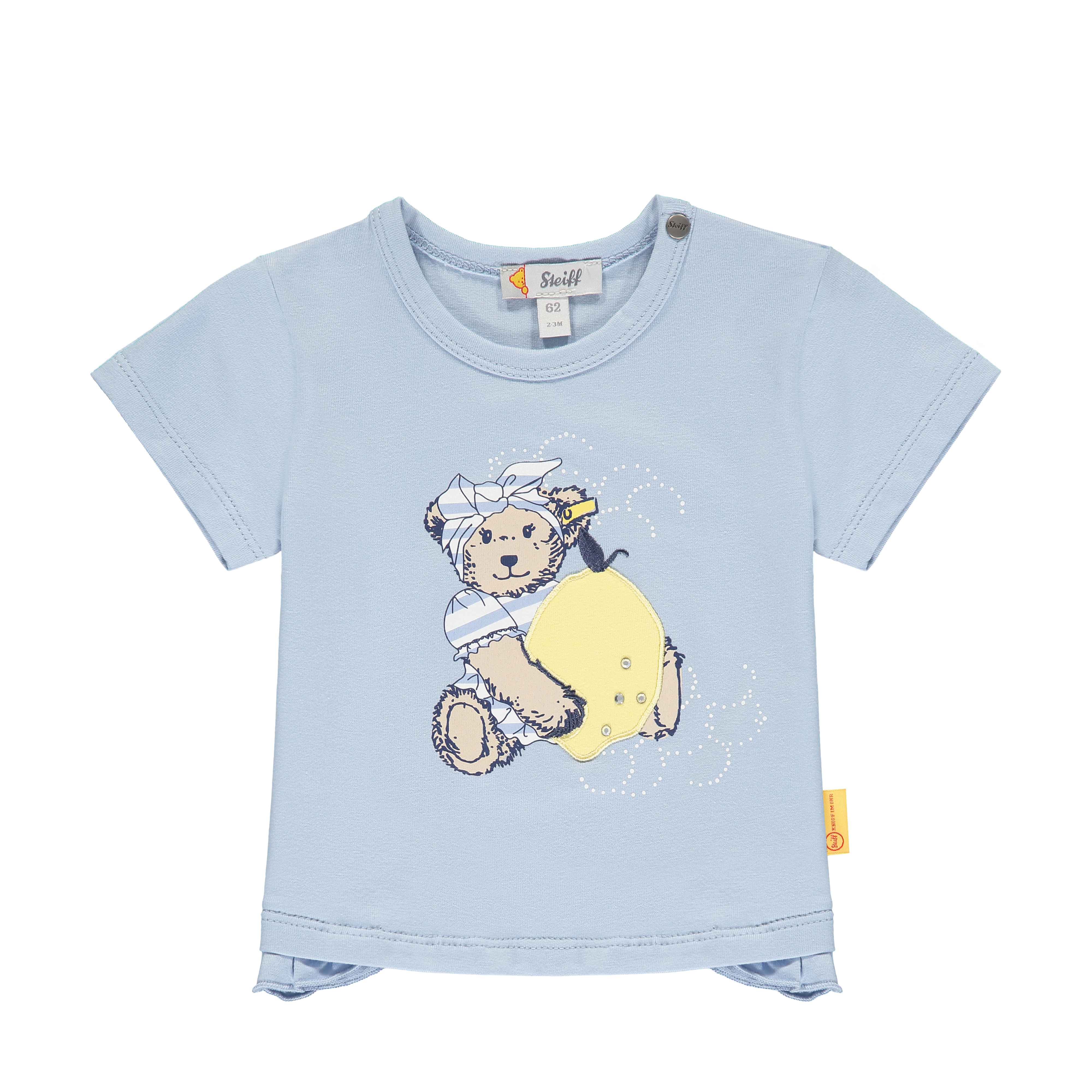 Футболка Hello Summer прикрашена симпатичним принтом на лицьовій стороні у вигляді чарівного ведмедика з лимоном. Виготовлена з м'якого, бавовняного трикотажу для максимального комфорту. Сертифікований матеріал повністю безпечний, не викликає алергічних реакцій. Бічні вставки з рюшами надають моделі особливої чарівності. Кнопки на плечі полегшують одягання. Еластична тканина і вільний крій дарують повноцінну свободу рухів.
