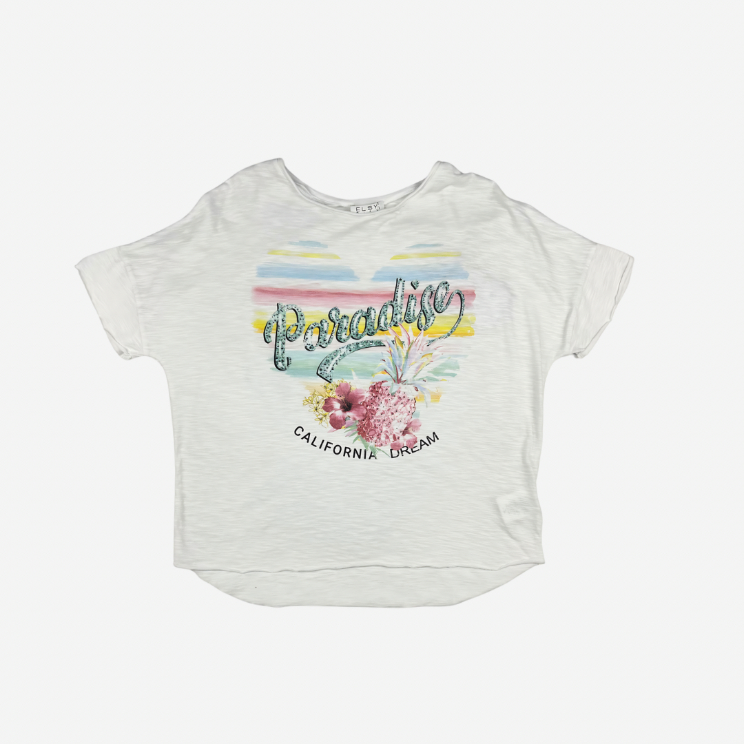 Вишукана футболка California створює легкий настрій літа завдяки яскравому принту з тропічними мотивами та ніжними відтінками. Натуральна бавовна забезпечує виняткову м’якість, дозволяє шкірі дихати та дарує комфорт протягом усього дня. Тканина приємна на дотик, добре зберігає форму та виглядає бездоганно навіть після частого носіння. Вільний силует додає образу невимушеності, не обмежує рухів і підходить для активного відпочинку. Ідеальний вибір для стильних підліткових образів із відчуттям преміальної якості.