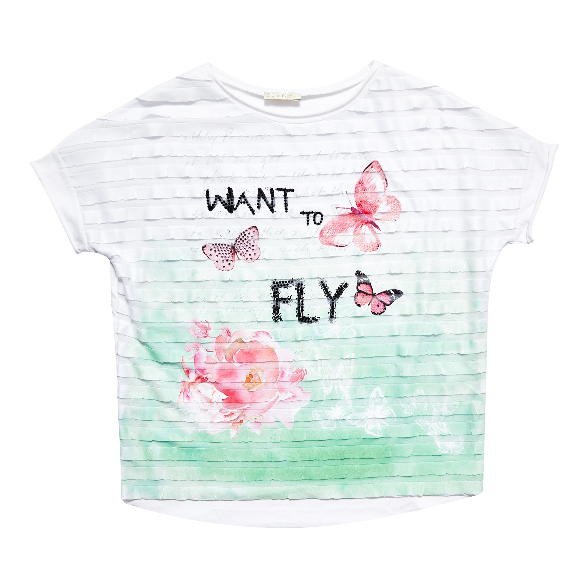Футболка Rafaella — це ніжна та по-справжньому чарівна модель, яка виглядає легко, романтично й одразу привертає увагу витонченим художнім дизайном. Основою виробу є натуральна бавовна, що дарує комфорт, м’якість і приємні відчуття до тіла, завдяки особливій суміші матеріалів футболка має еластичність, добре зберігає форму та виглядає охайно протягом усього дня. Модель відрізняється вільним кроєм, не сковує рухів і чудово підходить для активного ритму. Декоративний принт із метеликами, квітами та написом створює легкий, мрійливий настрій, фактурна поверхня додає образу об’єму й оригінальності. Футболка легко поєднується з джинсами, спідницями чи шортами, стаючи стильним акцентом повсякденного гардероба.