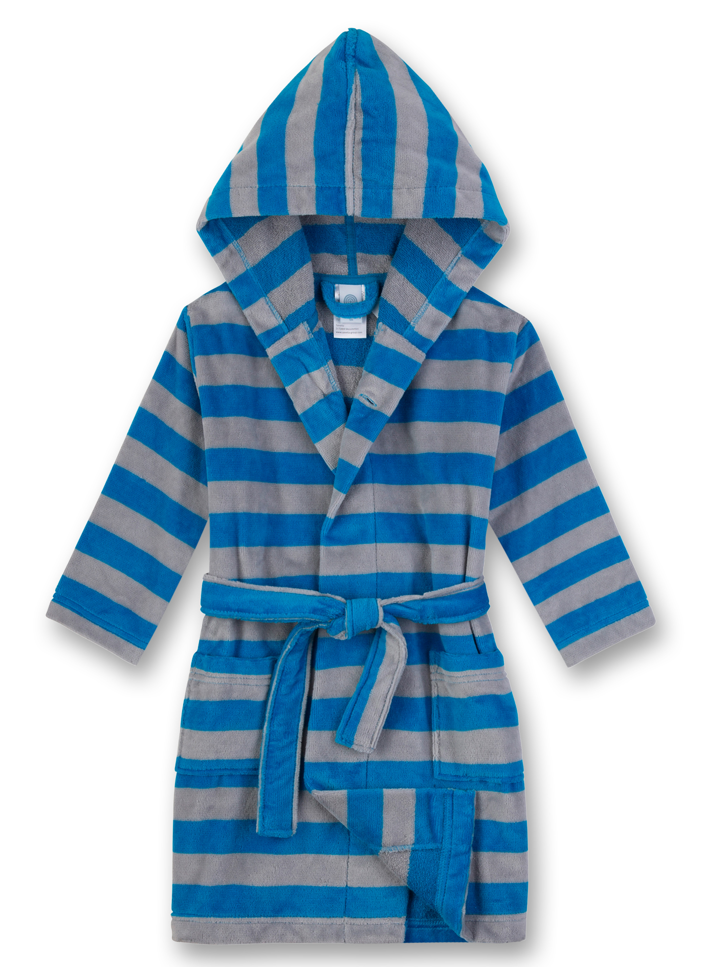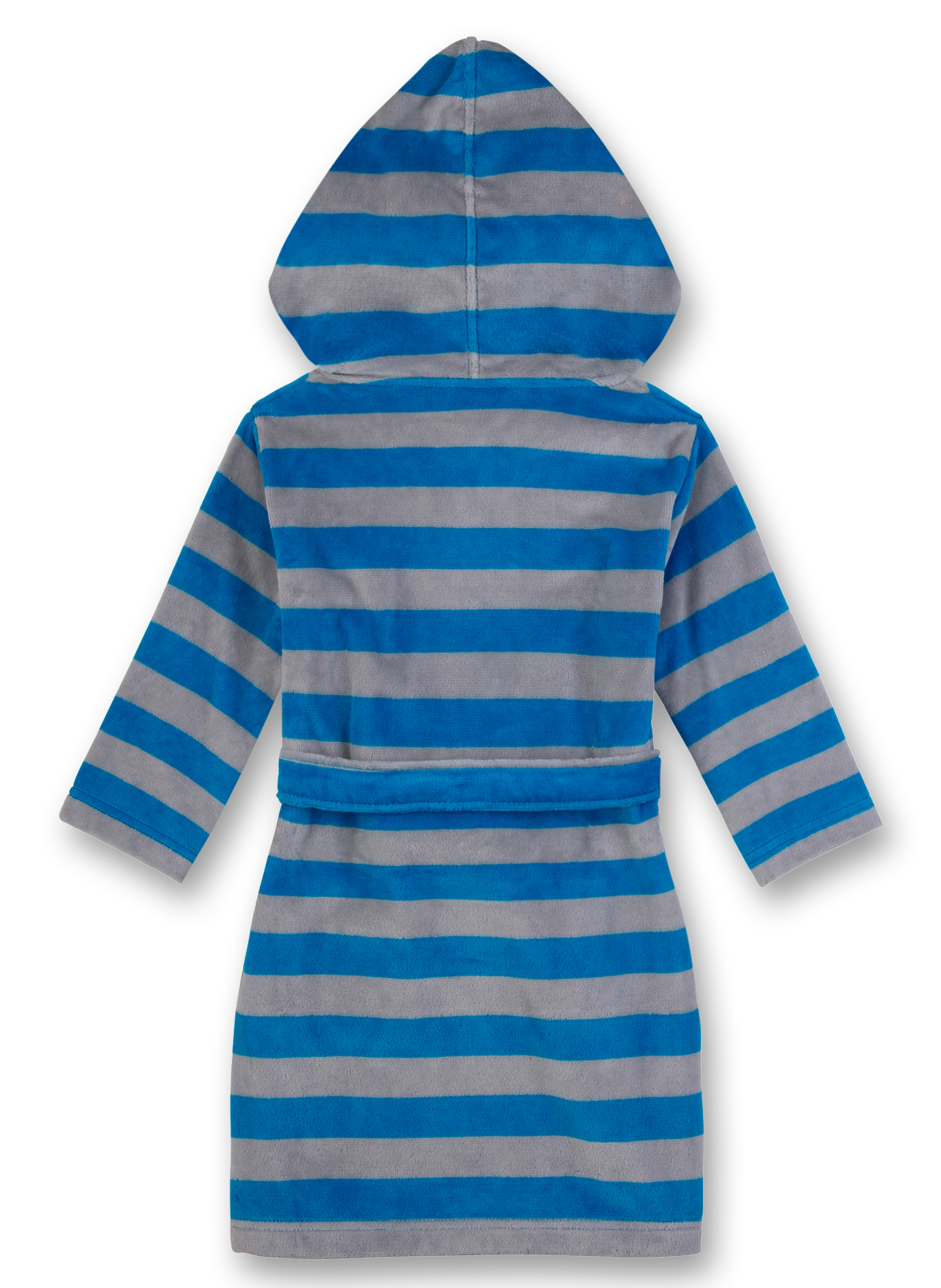 Бавовняний халат для хлопчика. Капюшон та м'яка бавовняна тканина зігріють після купання та інших водних процедур. Дві накладні кишені для маленьких іграшок або інших дрібниць. Посадка фіксується широким поясом. Приємний дизайн у синіх тонах.