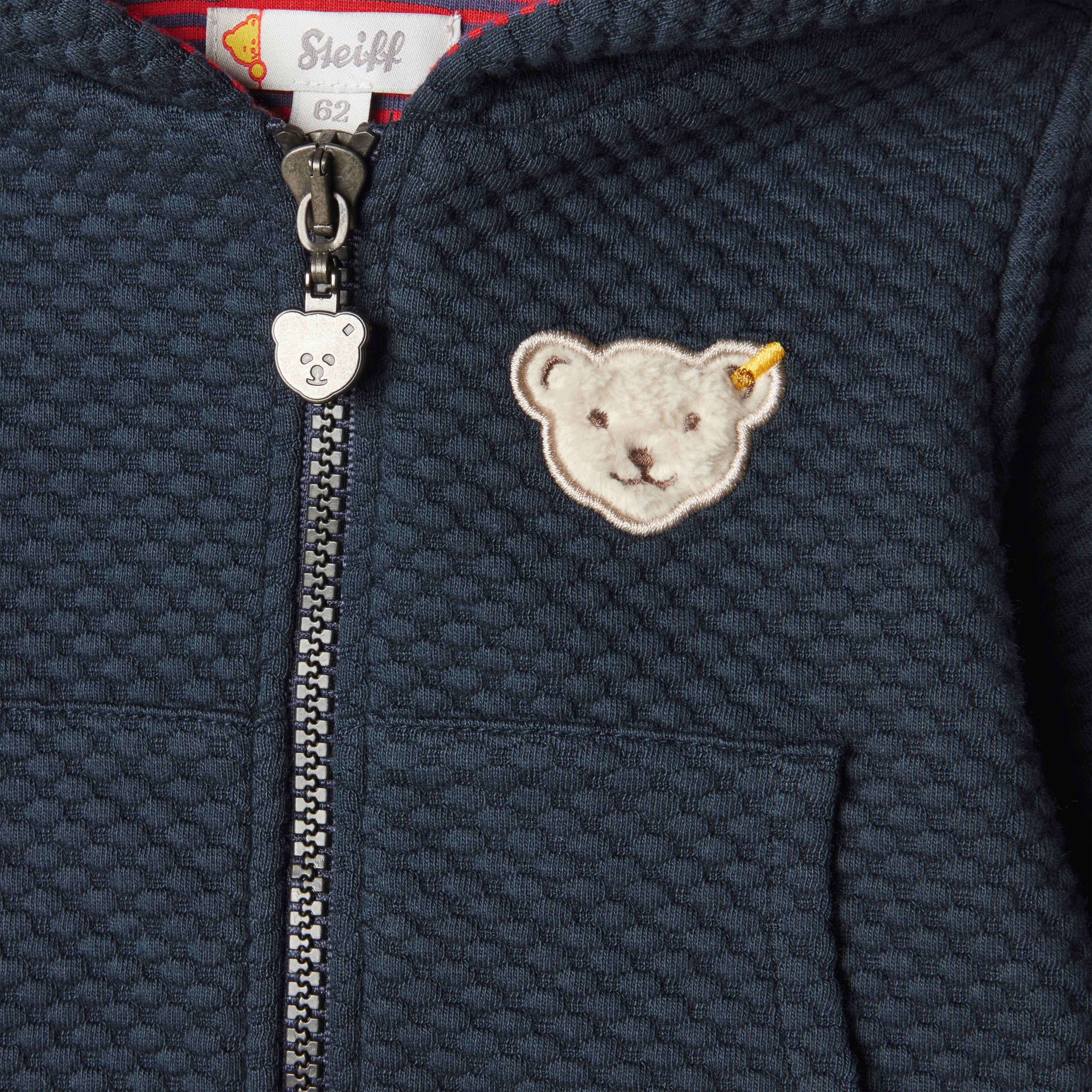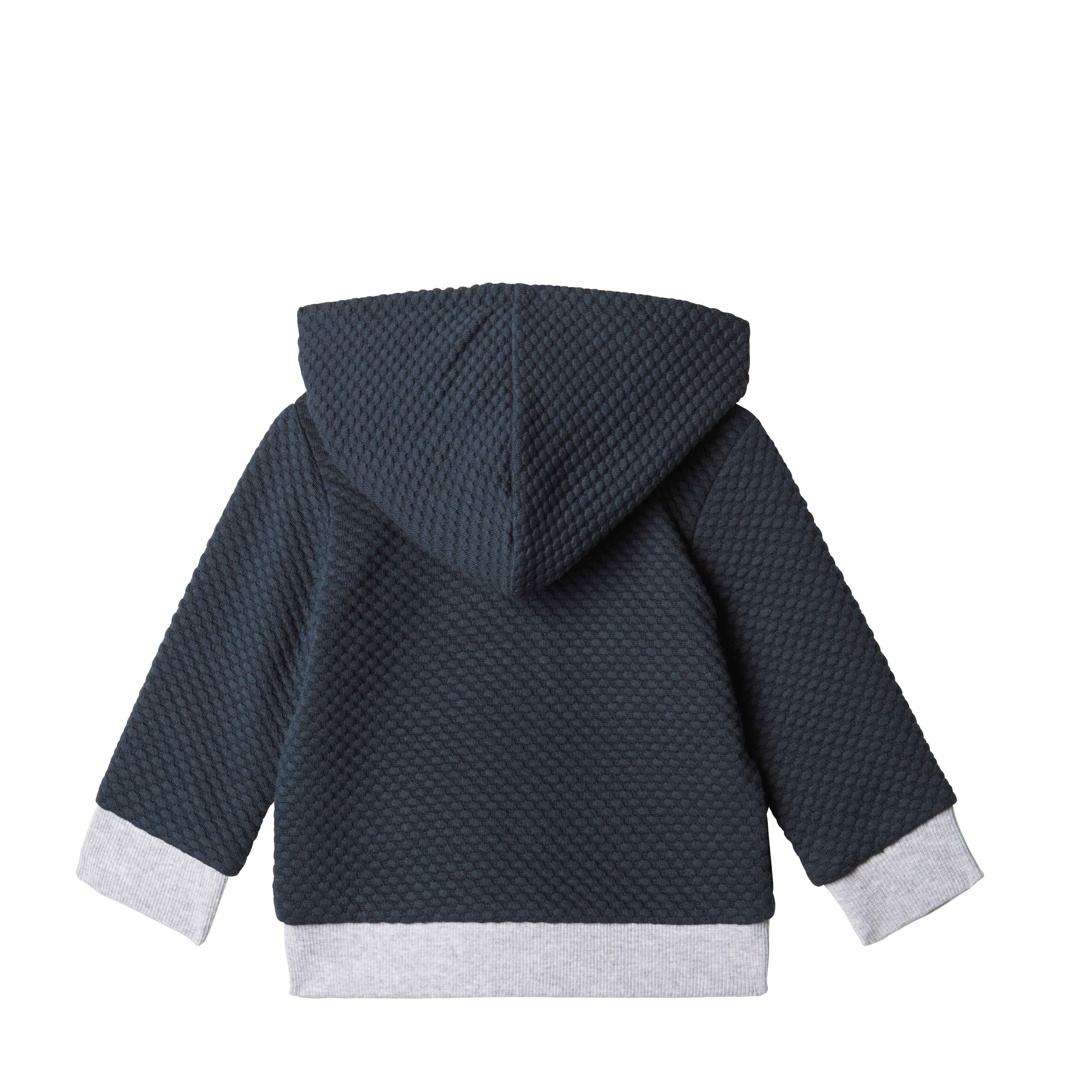 Затишна кофта Cosy Blue створена із щільної тканини на основі бавовни, абсолютно безпечної для ніжної шкіри немовлят. Тканинна підкладка забезпечує додатковий комфорт, а вільний крій дозволяє дитині вільно рухатися. Оригінальна текстура тканини додає виробу унікального вигляду, а капюшон захищає від прохолодного вітру. Практична застібка-блискавка дозволяє легко одягати дитину.