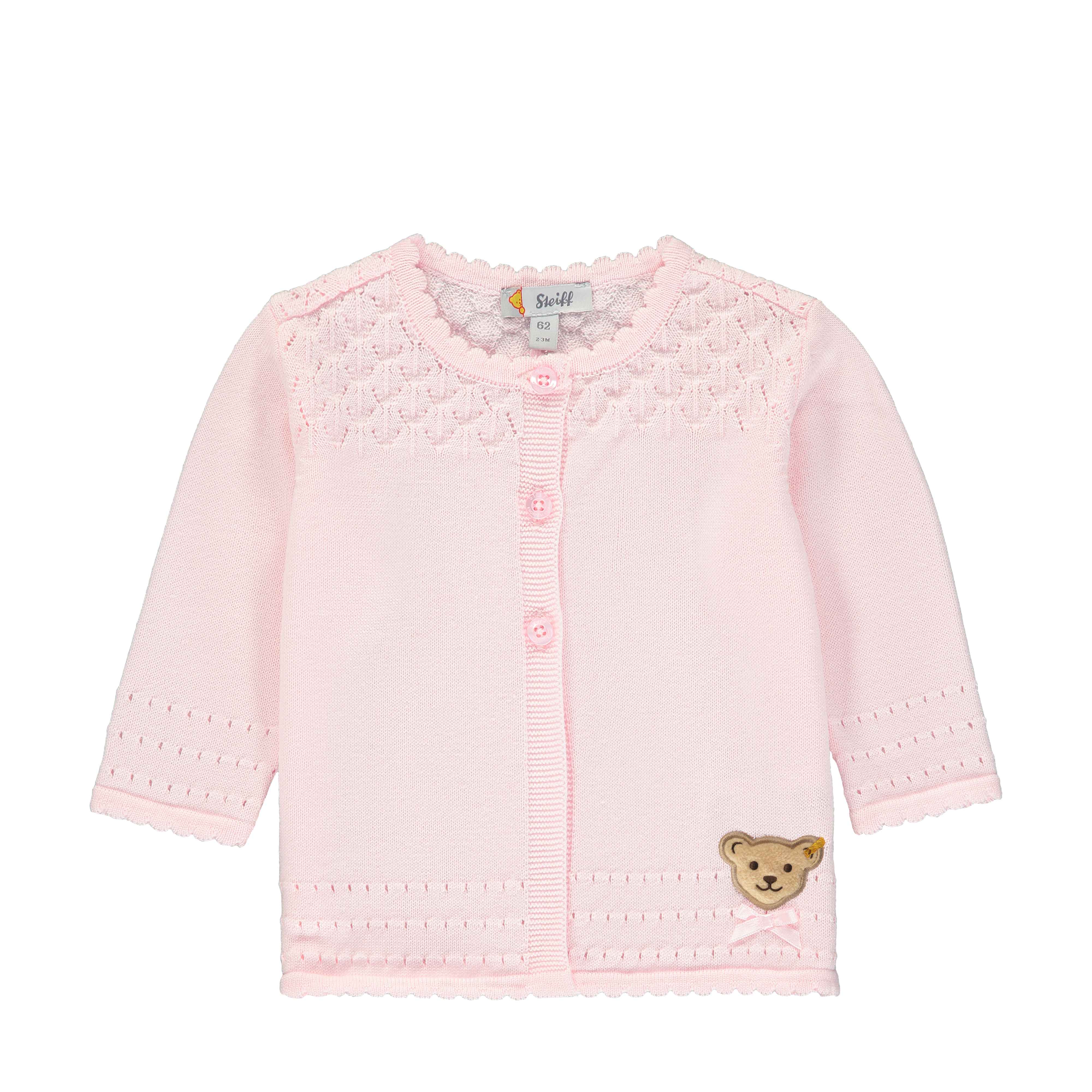Чарівна кофта Bear & Cherry має зручний вільний крій і стане бездоганним завершальним штрихом у гардеробі малятка. Сертифікований бавовняний матеріал повністю безпечний для дитини, не викликає алергічних реакцій. Застібається на ґудзики. Пухнастий ведмедик Steiff Teddy з атласним бантиком ідеально вписується в дизайн виробу.
