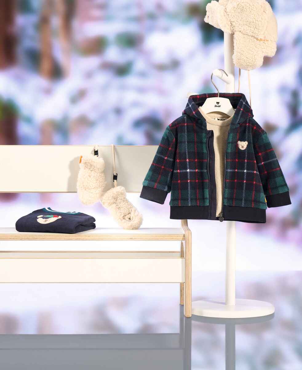Тепла флісова куртка Celebration створена для затишку та комфорту під час прохолодних прогулянок. Темно-синя клітинка з червоними та зеленими акцентами додає образу класичного шарму. М’який фліс приємно гріє, капюшон забезпечує додатковий захист від вітру. Ребристі манжети дарують зручну посадку, блискавка спереду робить перевдягання легким і швидким. На грудях – фірмовий ведмедик Steiff, який супроводжуватиме малюка у кожній новій мандрівці.