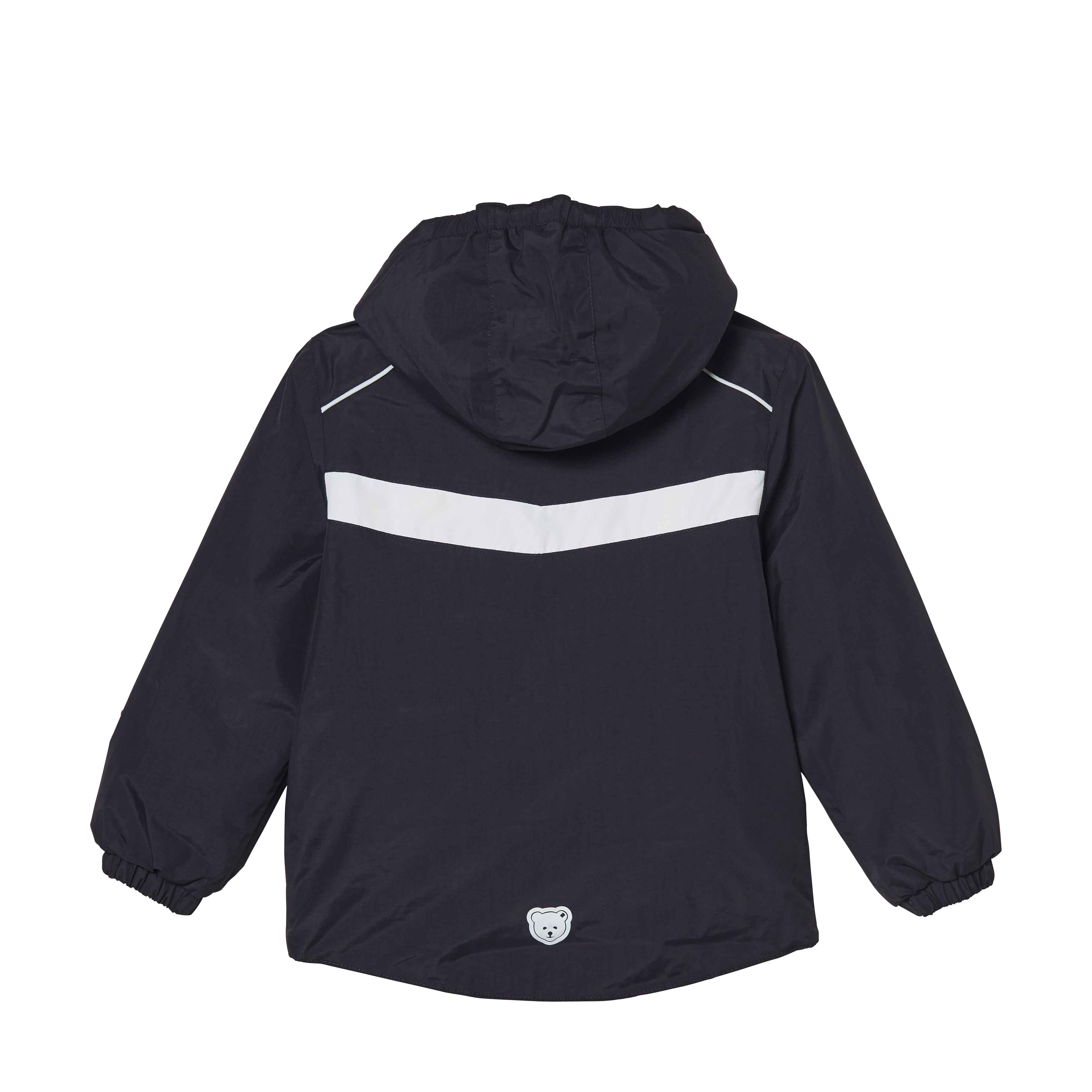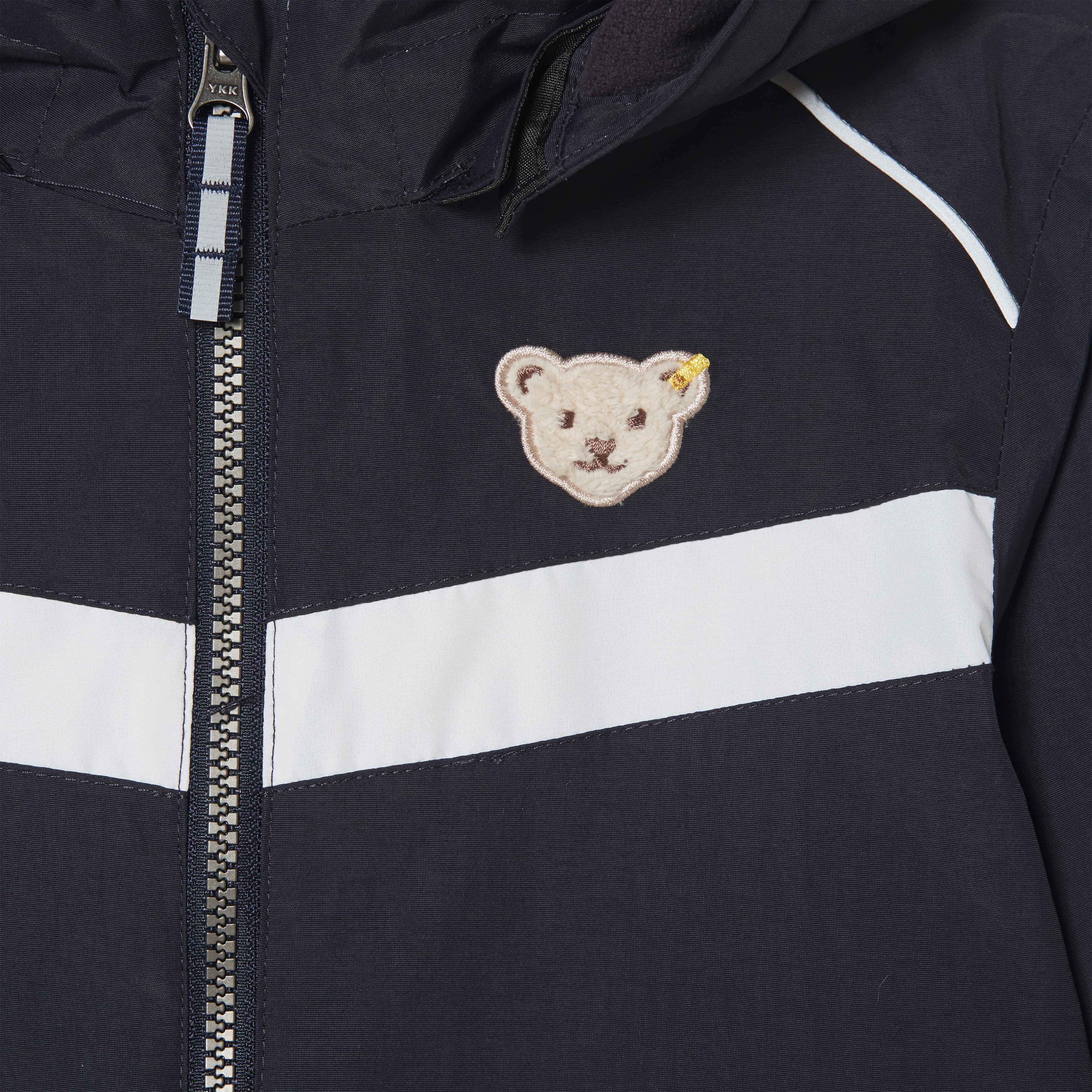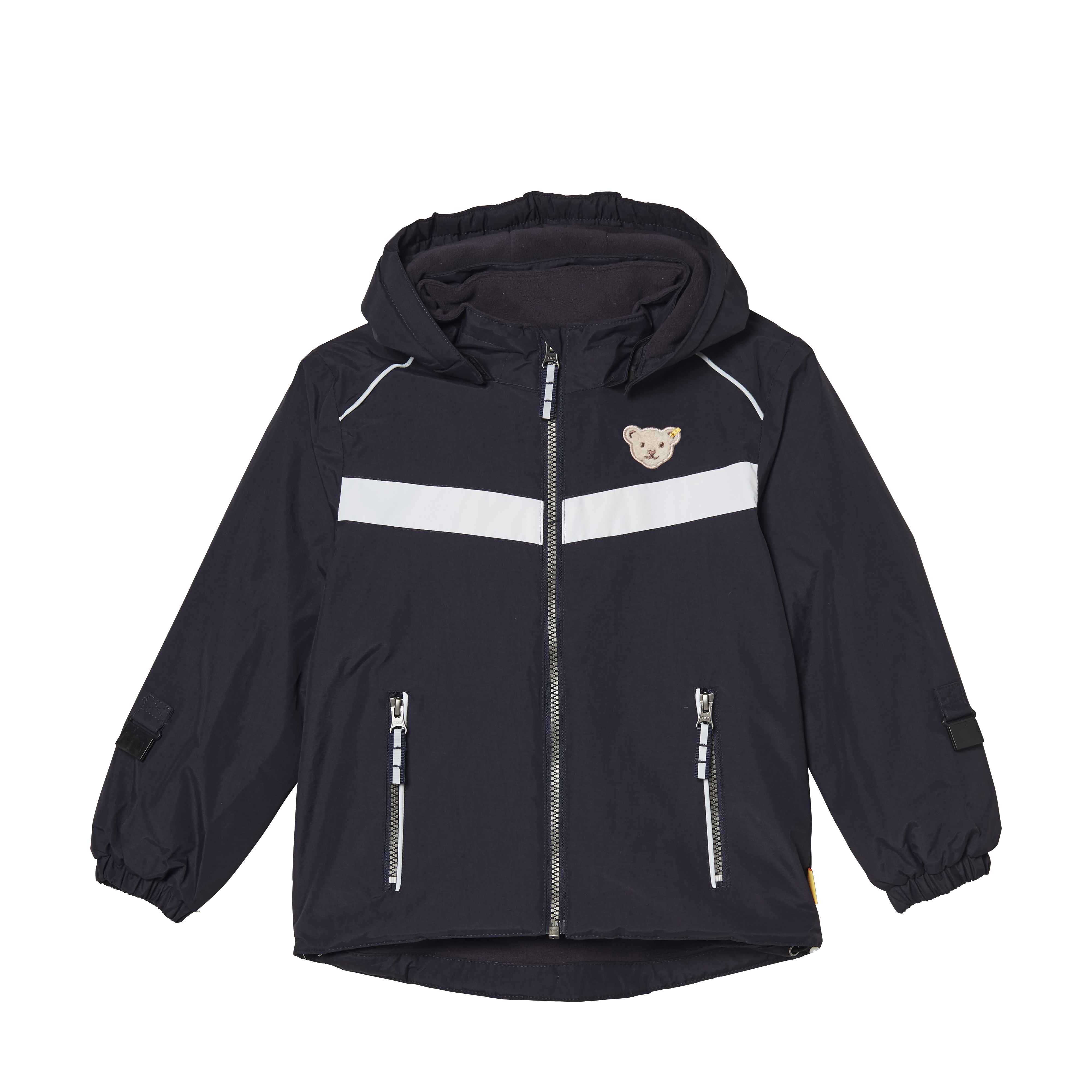 Практична і функціональна куртка Steiff Tec-Outerwear з капюшоном на флісовій підкладці створена для комфортних прогулянок і активностей на свіжому повітрі. На додаток до екологічно чистого водонепроникного просочення BIONIC-FINISH®ECO, що не містить фтору, ця куртка пропонує такі функції: 100% вітро- і водонепроникність, водонепроникність 8000 мм, зносостійкість 50 000, а також проклеєні шви. Захисний капюшон відстібається сам, якщо зачепиться. Куртка має еластичні манжети та блискавку із захистом підборіддя. Мотив пухнастого плюшевого ведмедика Steiff спереду та світловідбивний плюшевий ведмедик Steiff доповнюють дизайн виробу і роблять малюка помітним у темний час доби