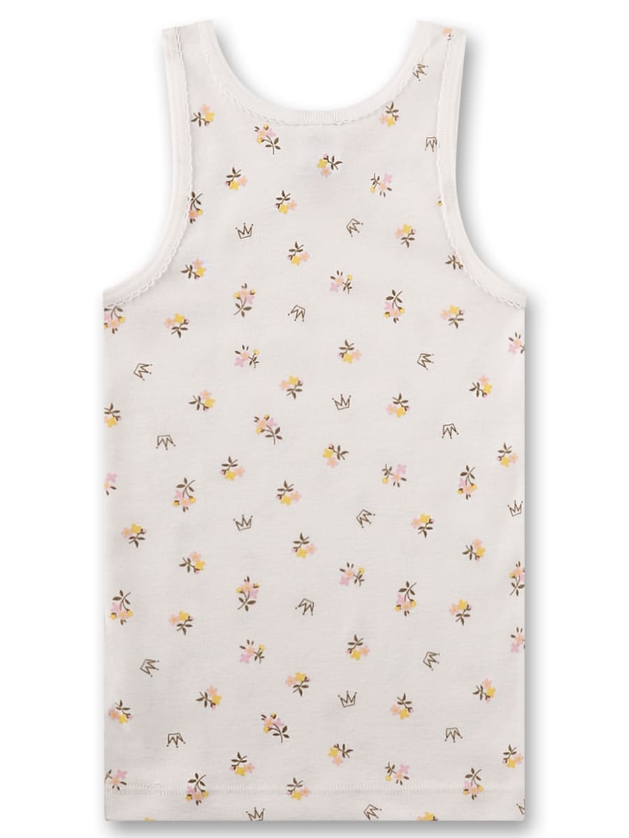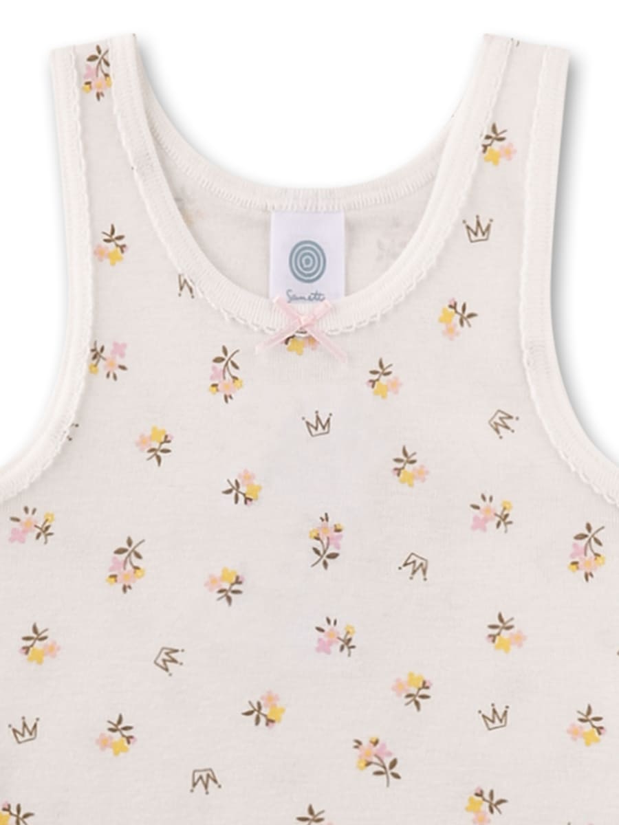 Майка Small bouquets — витончена базова річ для дівчинки, прикрашена ніжним принтом маленьких квітів і корон, що створює легкий та чарівний образ. Модель виготовлена з органічної бавовни, яка відзначається м’якістю, добре пропускає повітря та дарує комфортні відчуття протягом усього дня. Акуратна обробка країв, приємна до тіла тканина та зручний крій забезпечують свободу рухів і комфортну посадку. Маленький декоративний бантик на вирізі додає образу особливої ніжності та робить майку чудовим вибором для щоденного носіння. Матеріал сертифікований незалежними європейськими інститутами Organic Cotton, безпечний до здоров'я дитини, вільний від шкідливих сполучень.