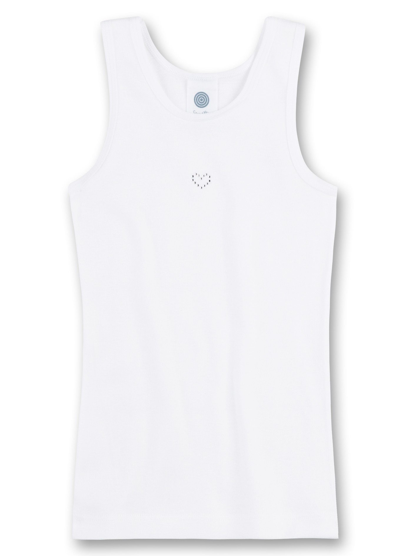 Красива біла майка для дівчаток. Виконана з м'якого тонкого трикотажу без бічних швів. Органічна бавовна приємна до тіла, добре вбирає вологу і комфортна в носінні. Дизайн також сподобається дівчатам. Ніжне мереживо по круглому вирізу і трохи серця зі страз на грудях надають романтичну нотку.