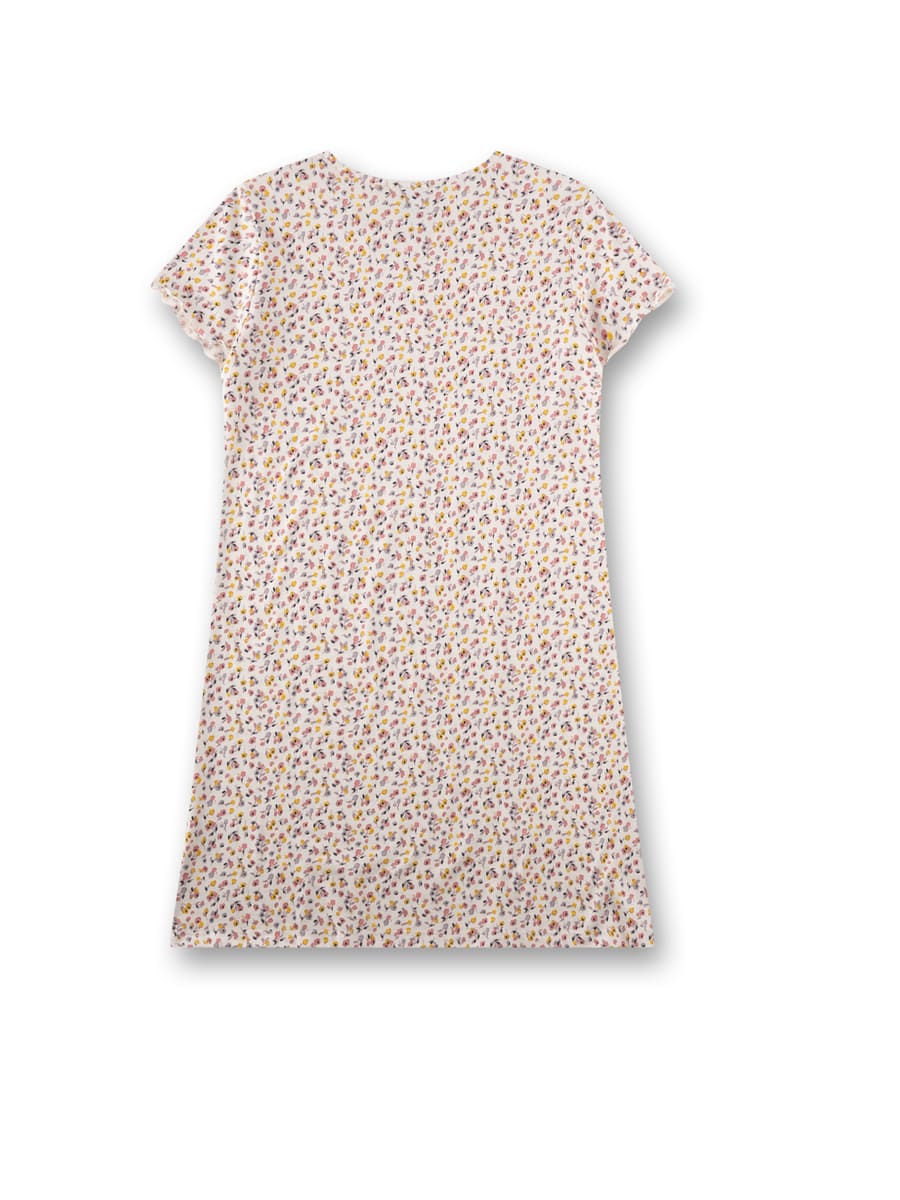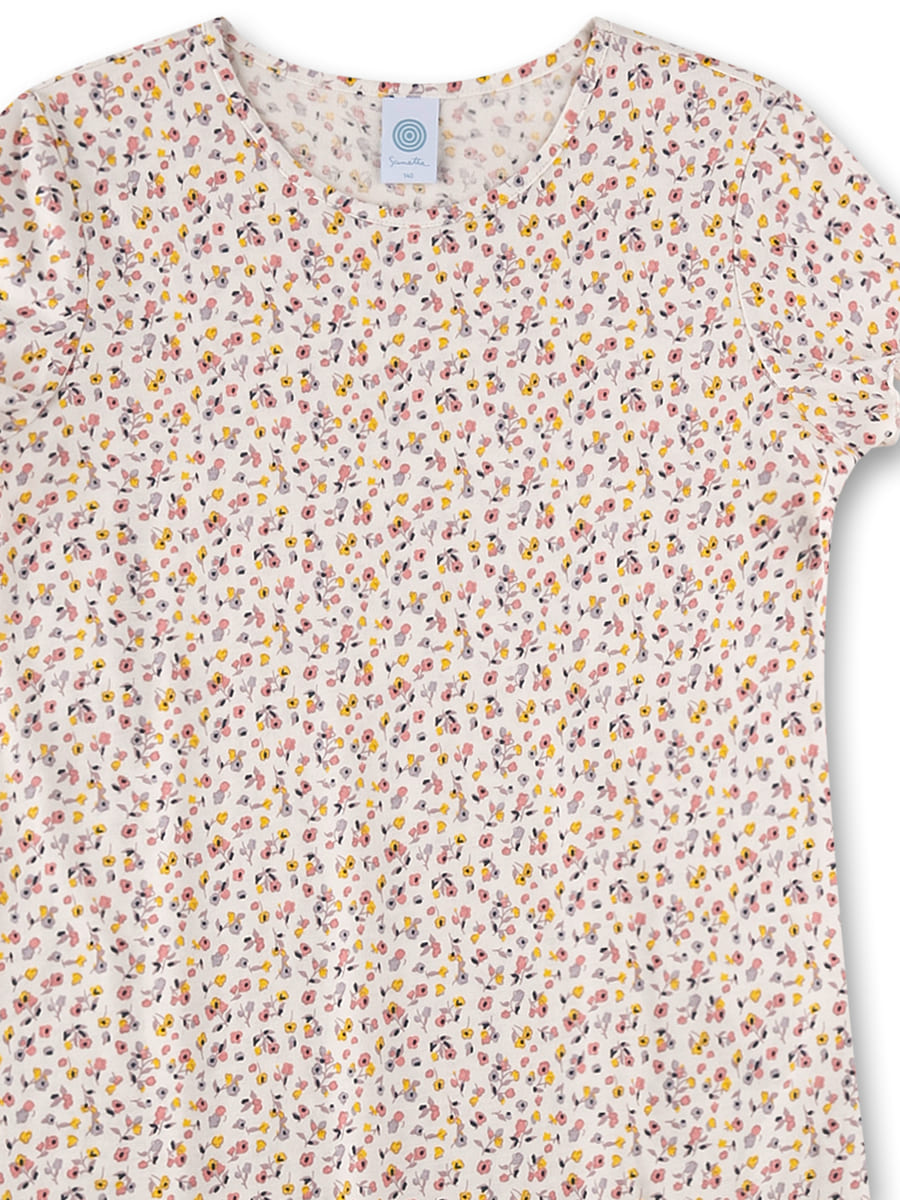 Нічна сорочка Small Flowers — легка та ніжна модель для дівчаток із чарівним квітковим принтом. Виріб виготовлений з м’якого та приємного до тіла трикотажу з бавовни та модалу, який добре пропускає повітря, дарує комфорт і делікатно торкається шкіри. Світла основа прикрашена дрібним різнобарвним квітковим візерунком, що створює ніжний та літній настрій. Класичний круглий виріз і короткі рукави з хвилястим краєм додають моделі легкості та дівочої чарівності.
