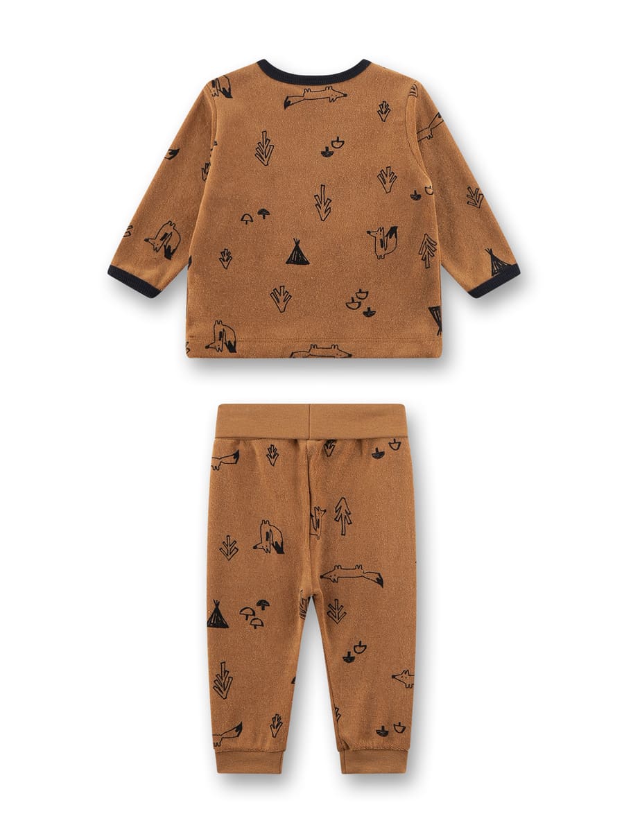 Піжама Foxes у теплому коричневому кольорі дарує малюкам затишок і тепло під час сну. М’який махровий матеріал ніжно торкається делікатної дитячої шкіри, забезпечуючи комфорт і приємні відчуття. Грайливий принт із лисичками та лісовими мотивами робить комплект чарівним і стильним. Штанці з комфортним поясом і кофточка із застібкою на плечі забезпечують зручність під час перевдягання та ідеальну посадку.