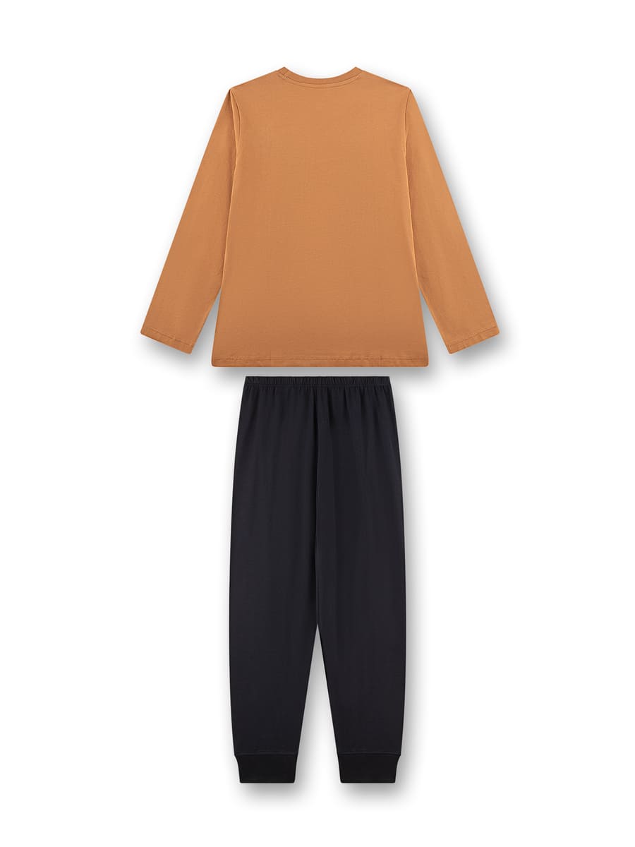 Піжама Space створена для юних мрійників і прихильників космосу. Лонгслів у теплому коньячному відтінку прикрашений ефектним принтом із трьома астронавтами на місячній поверхні, що робить образ особливо виразним. Чорні штани з еластичним поясом і манжетами забезпечують комфорт і свободу рухів. М’яка бавовняна тканина приємна до тіла й ідеально підходить для спокійного сну та космічних мрій.