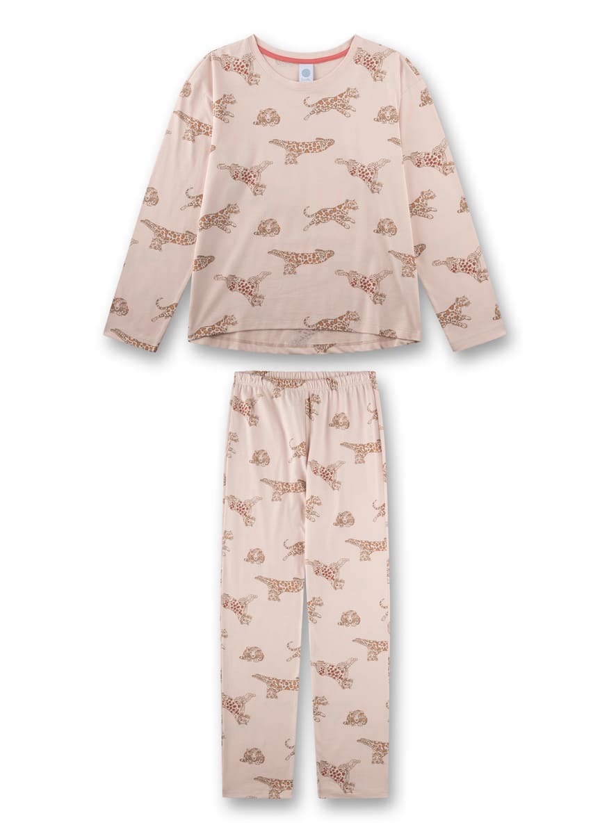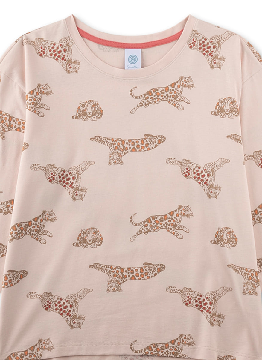 Піжама Flying Tiger — комплект для дівчинки із витонченим анімалістичним принтом для стильного домашнього образу. М’який відтінок рожево-бежевого з трендовим принтом у вигляді тигрів надає модного акценту, зберігаючи ніжність та елегантність. Лонгслів із комфортною посадкою та довгі штани з еластичним поясом забезпечують свободу рухів і зручність протягом усього дня. Виготовлена з натуральної високоякісної бавовни, тканина приємна до тіла, дихаюча та ідеально підходить для затишних ночей і домашнього відпочинку.
