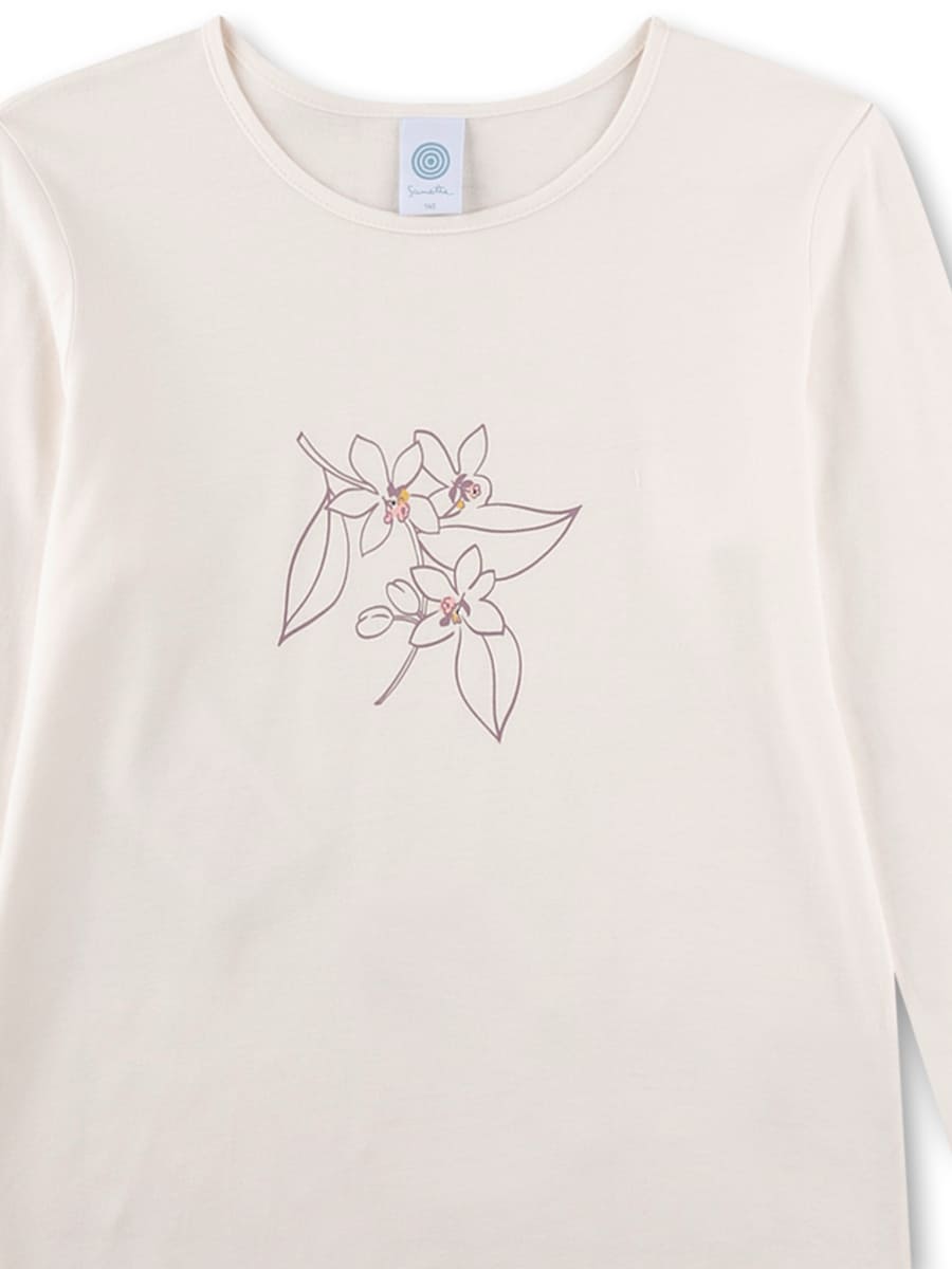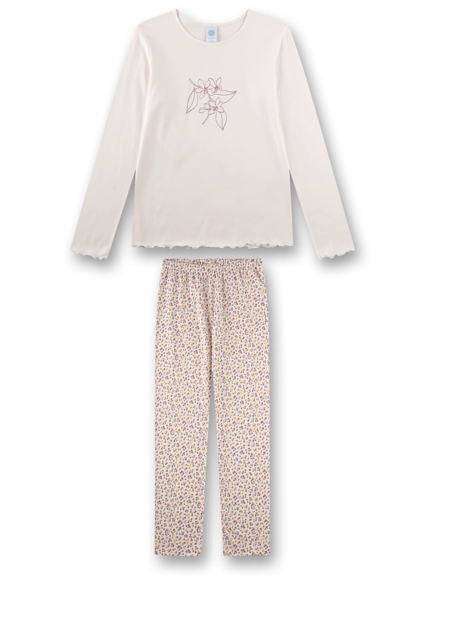 Піжама Small Flowers — ніжний комплект для дівчаток, що поєднує комфорт і витончений квітковий дизайн. Модель виготовлена з м’якого та приємного до тіла трикотажу з бавовни та модалу, який добре пропускає повітря, делікатно торкається шкіри та забезпечує комфорт під час сну. Лонгслів світлого відтінку має класичний круглий виріз, прикрашений витонченим малюнком квітів, хвилясті краї на рукавах і подолі додають образу ніжності. Штани з барвистим квітковим принтом і еластичним поясом забезпечують зручну посадку та свободу рухів.