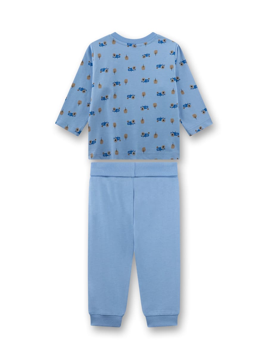 Піжама Blue Tractor — затишний комплект для малюків із милим принтом тракторців у ніжних блакитних відтінках. Виготовлений з органічної бавовни, сертифікованої за стандартом GOTS та протестованої відповідно до Oeko-Tex Standard 100, тканина особливо м’яка, дихаюча й безпечна для ніжної дитячої шкіри. Лонгслів прикрашений чарівним візерунком із маленькими тракторами та деревцями, однотонні штанці гармонійно доповнюють образ. Манжети на рукавах і штанинах забезпечують зручну посадку та свободу рухів під час сну й активних ігор. Практичний у догляді комплект, який можна сушити в сушильній машині.