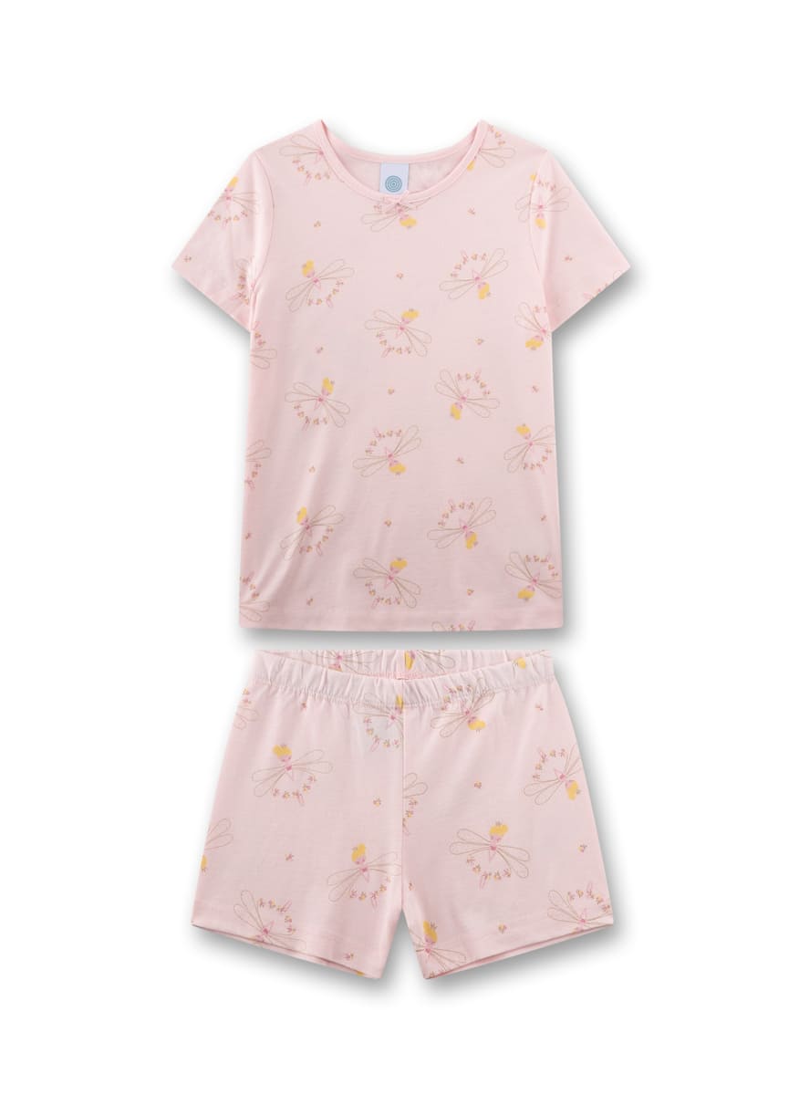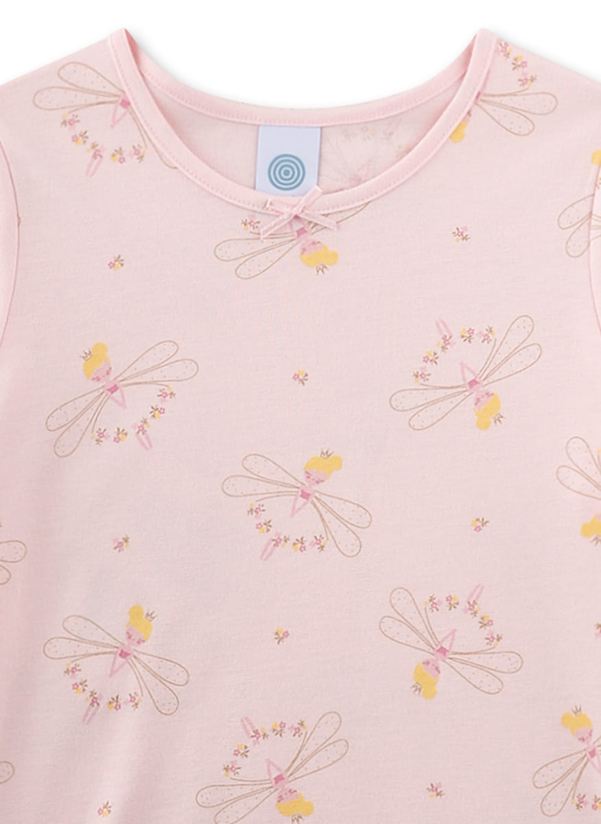 Піжама Dragonfly — легкий і ніжний комплект для дівчаток, що створює атмосферу казки та безтурботних снів. Модель виготовлена з м’якого трикотажу на основі бавовни та модалу, який добре пропускає повітря, приємний до шкіри та забезпечує комфорт у теплі ночі. Футболка з короткими рукавами має круглий виріз із маленьким декоративним бантиком, що додає образу ніжності. Шорти з еластичним поясом забезпечують зручну посадку та свободу рухів. Світло-рожеву основу прикрашає чарівний принт із маленькими феями, зірочками та квітами, що надає комплекту казкового настрою.