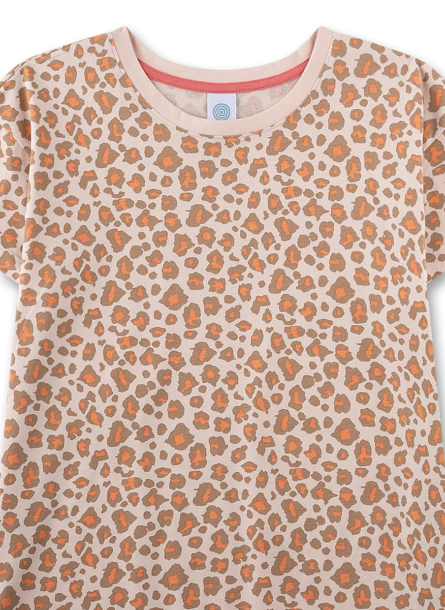 Піжама Flying Tiger — яскравий підлітковий комплект для дівчат із модним леопардовим принтом, що додає образу грайливі нотки та стиль. Ніжний рожево-бежевий фон у поєднанні з гармонійними плямами у відтінках бежу й абрикосу створює трендовий вигляд. Футболка з коротким рукавом має круглу горловину з контрастною обробкою, шорти доповнені еластичним поясом для максимальної зручності. Виконана з натуральної високоякісної бавовни, тканина м’яка, дихаюча та безпечна для чутливої шкіри.