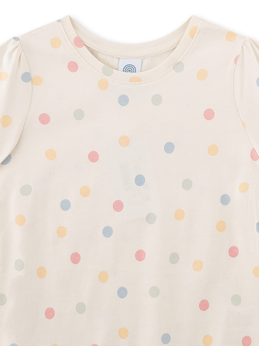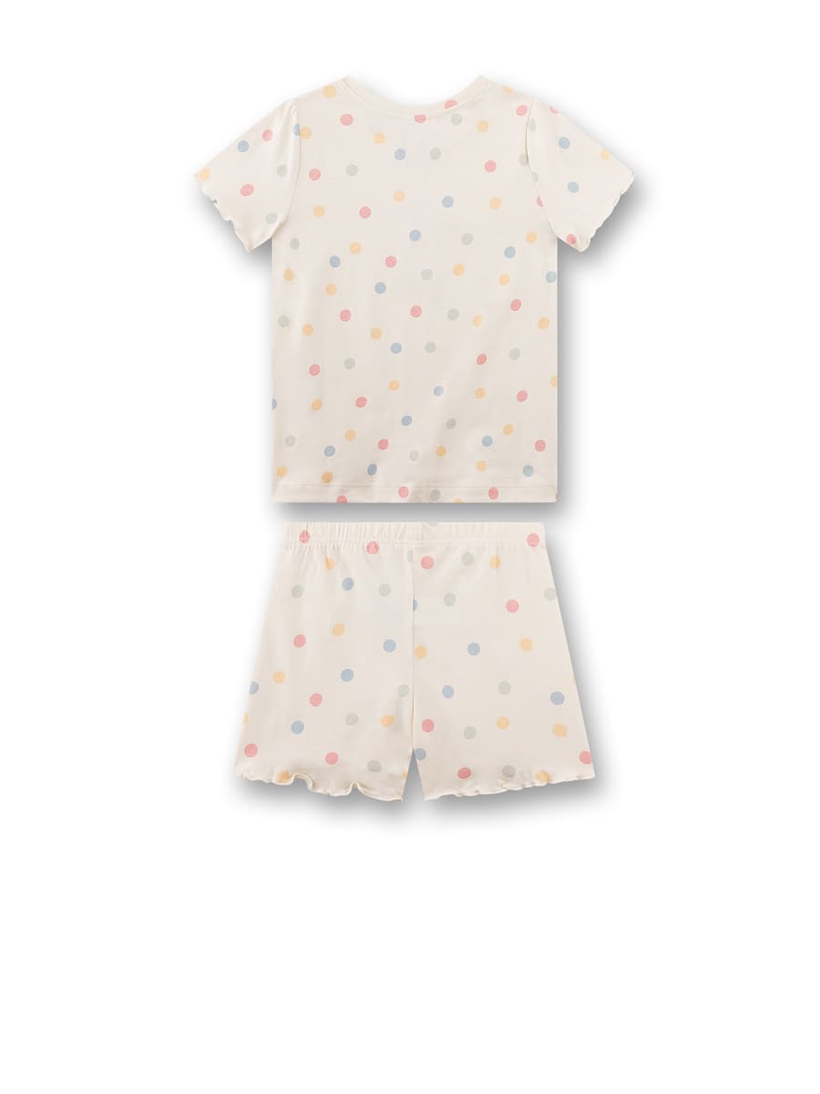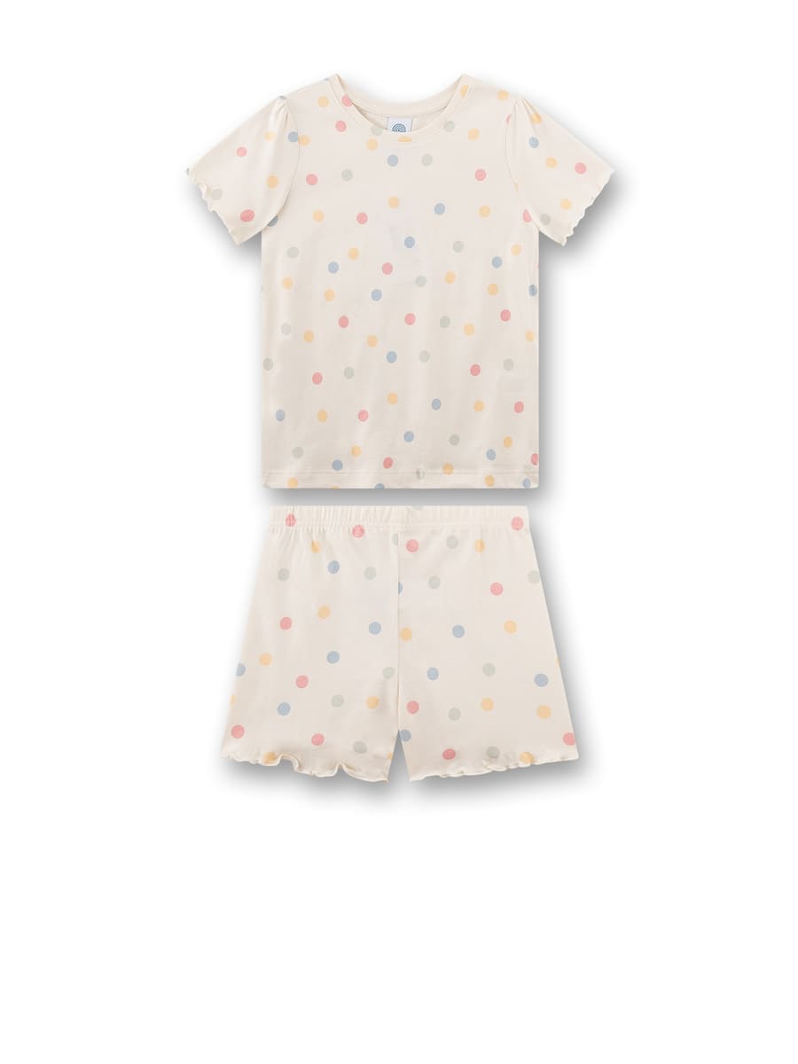 Піжама Peas — ніжний комплект для дівчаток, створений для комфортних і легких ночей. Модель виконана з дихаючого трикотажу single jersey на основі органічної бавовни (GOTS), що забезпечує м’якість і природні відчуття на шкірі. Кремова основа прикрашена яскравим різнокольоровим принтом у горошок, який додає образу грайливості. Короткі рукави та шорти оздоблені акуратним хвилястим краєм, що підкреслює ніжний, дівочий стиль. Еластичний пояс забезпечує зручну посадку та свободу рухів. Матеріал сертифікований незалежними європейськими інститутами Organic Cotton, безпечний до здоров'я дитини, вільний від шкідливих сполучень.
