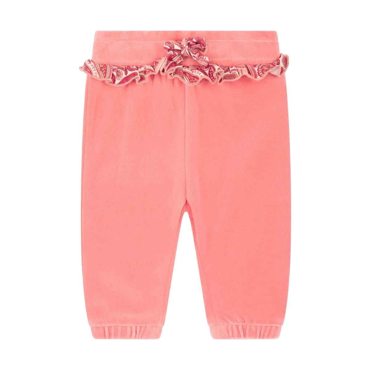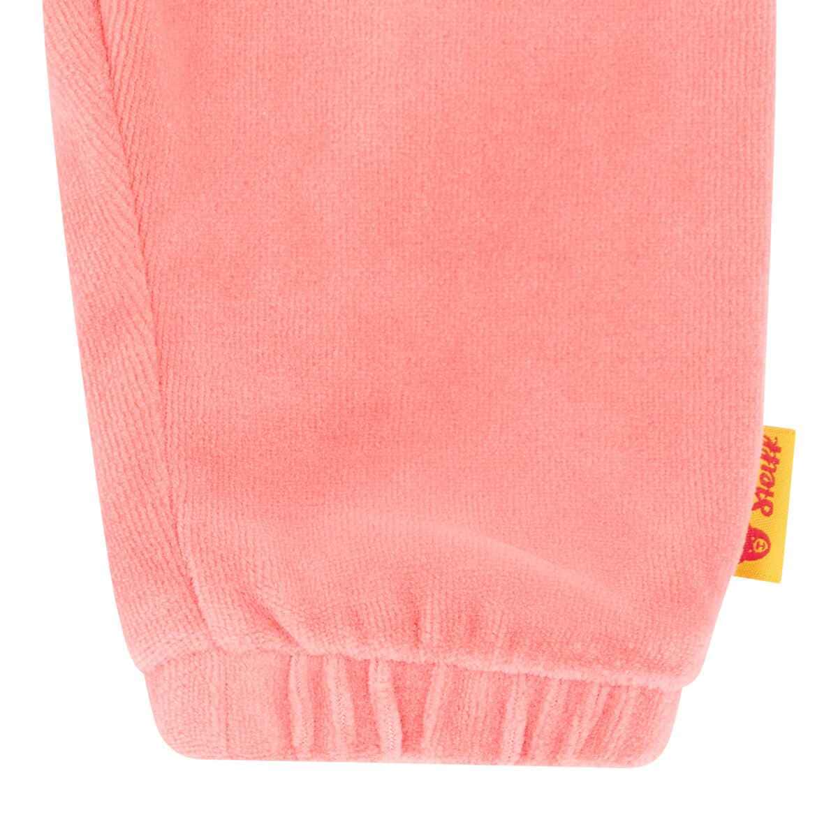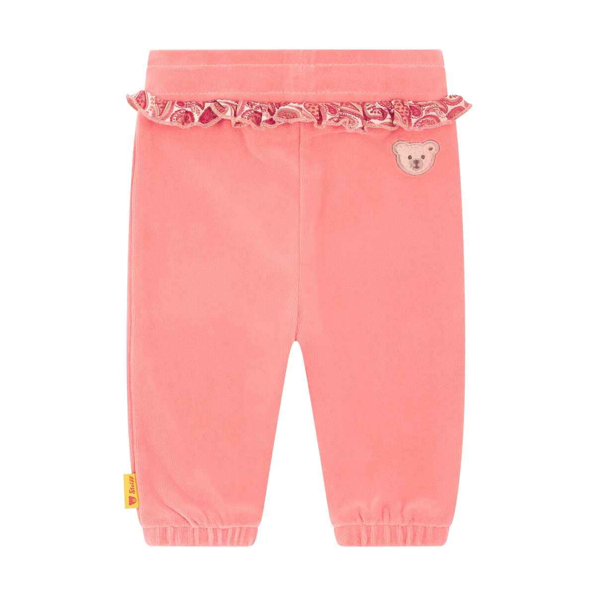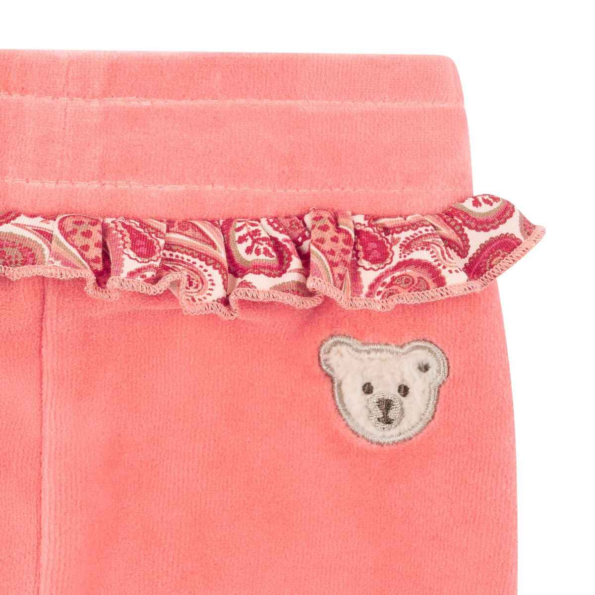Штани Woodland – затишний вибір для маленьких модниць. М’який велюр дарує приємні відчуття та комфорт упродовж усього дня. Еластичний пояс прикрашений ніжною воланкою у стилі пейслі, що надає образу грайливого шарму та забезпечує зручну посадку. Манжети з резинкою доповнюють дизайн і створюють додатковий затишок. На спинці розташований фірмовий ведмедик Steiff – милий акцент, що робить цю модель особливою.