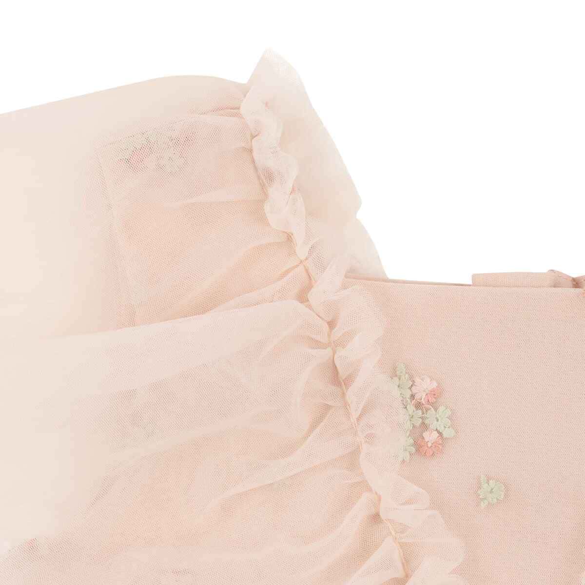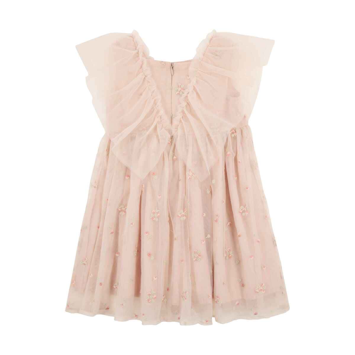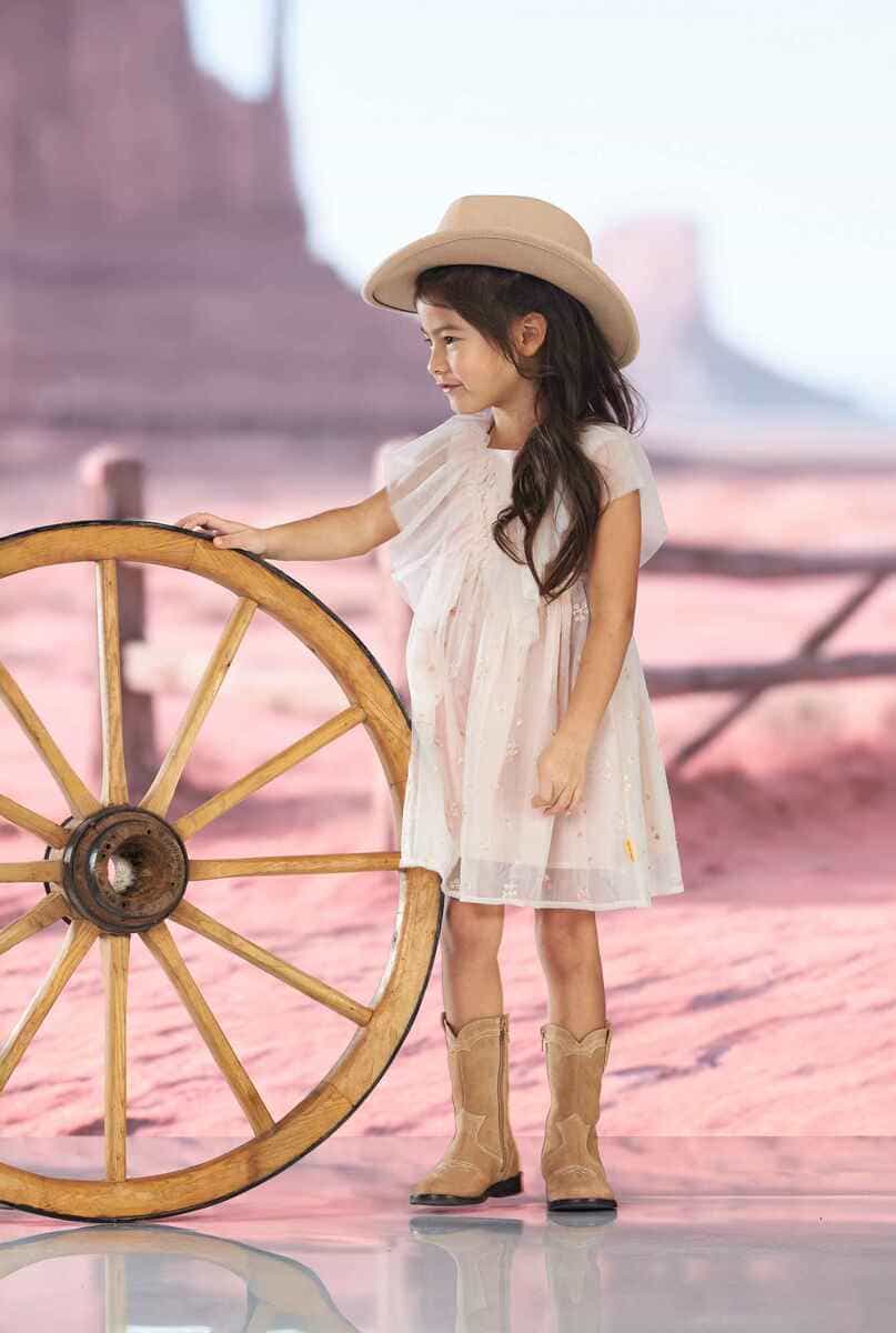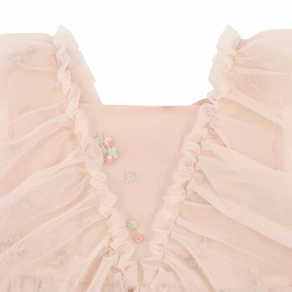 Сукня Western Core вражає ніжним дизайном і створює святковий образ із витонченим романтичним настроєм. Легкий тюль із делікатною квітковою вишивкою формує повітряний силует, надає образу особливої легкості та шарму. М’яка підкладка забезпечує комфорт і приємні відчуття під час носіння. Завищена лінія талії підкреслює силует, пишна спідниця красиво рухається при кожному кроці. Рюші на передній частині та плечах додають грайливого акценту й об’єму. Потайна блискавка на спинці робить процес одягання швидким і зручним.