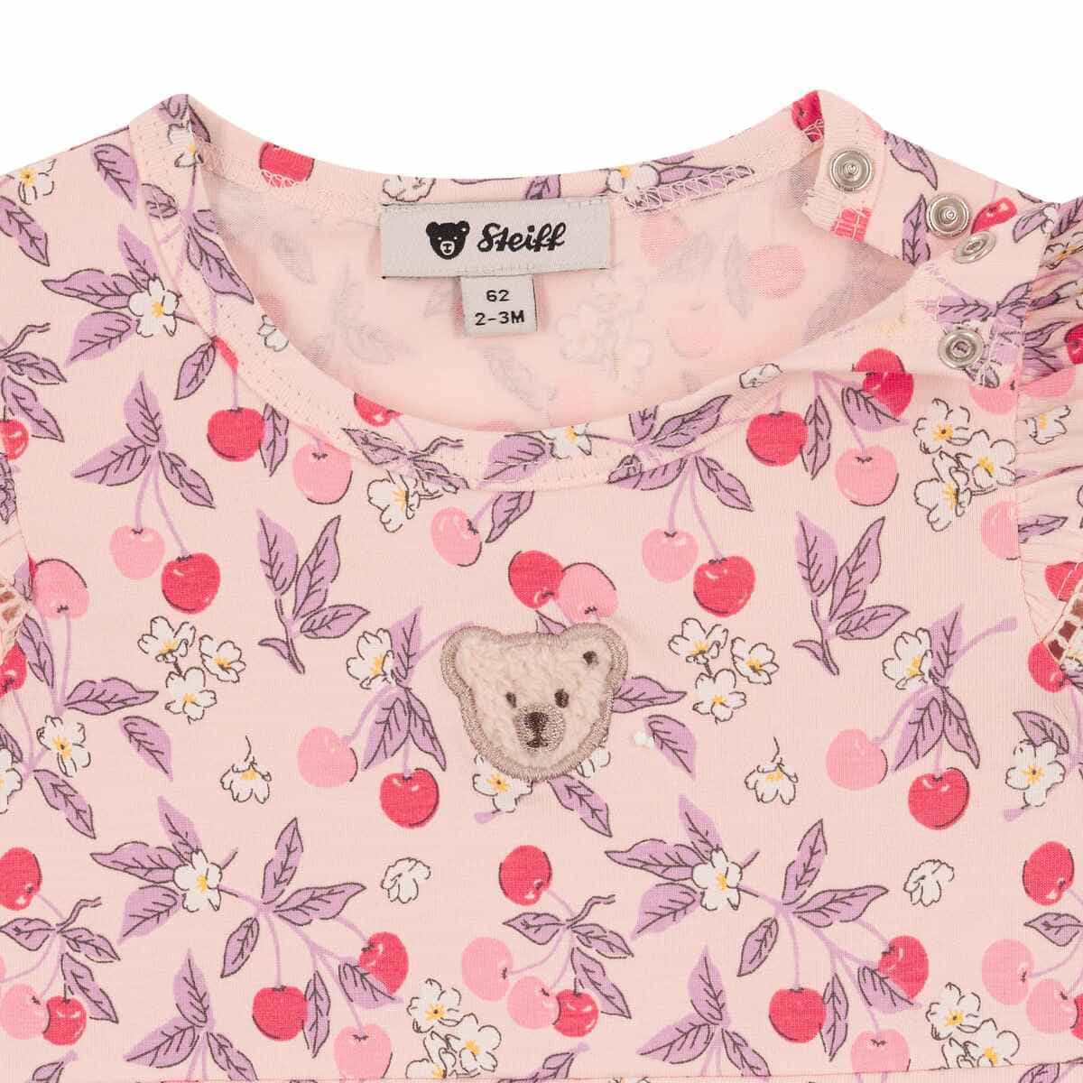 Вишукана сукня Cherry Cake наповнює образ легкістю, ніжністю та святковим настроєм. Натуральна бавовна у складі приємна до тіла, добре пропускає повітря та забезпечує комфорт протягом дня. Яскравий фруктовий принт створює виразний акцент і додає літньої свіжості. Завищена лінія талії формує витончену силуетну форму. Легкі рюші на рукавах підкреслюють делікатність дизайну. Мереживна обробка по низу надає завершеного вигляду. Застібки ззаду спрощують переодягання. Фірмовий ведмедик додає виробу впізнаваного шарму.