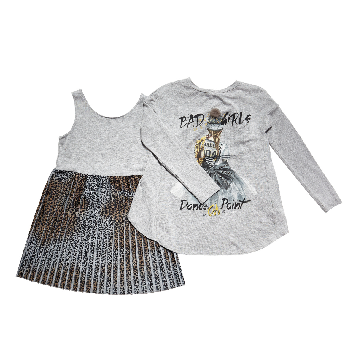 Стильний комплект Zandra, що складається з легкого сарафана та лонгсліву з принтом — практичне й модне поєднання для активних дівчат. Сарафан з плісированою спідницею з актуальним тваринним мотивом, що надає образу виразності. Лонгслів має м’яку приємну фактуру та стильний малюнок, який робить комплект ще більш сучасним.