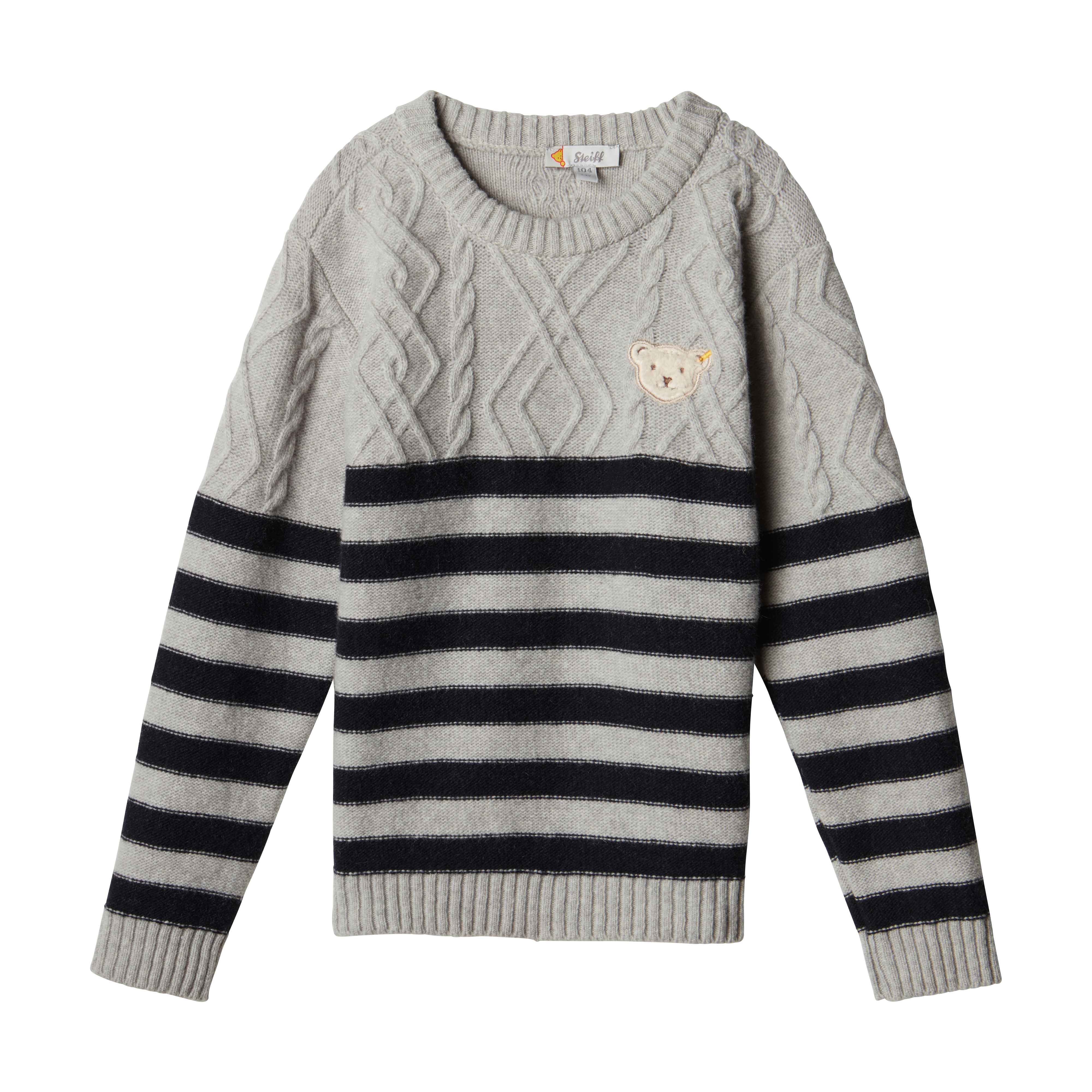 Класичний і елегантний светр Red and Blue Winter створений на основі м'якої, ніжної вовни, що гарантує оптимальне збереження тепла і комфорт для дитини. Еластична ребриста обробка не тільки надає виробу стильного зовнішнього вигляду, а й збільшує його зносостійкість. Пухнастий ведмедик Steiff Teddy ідеально вписується в загальний дизайн.