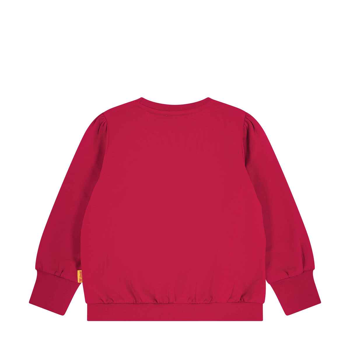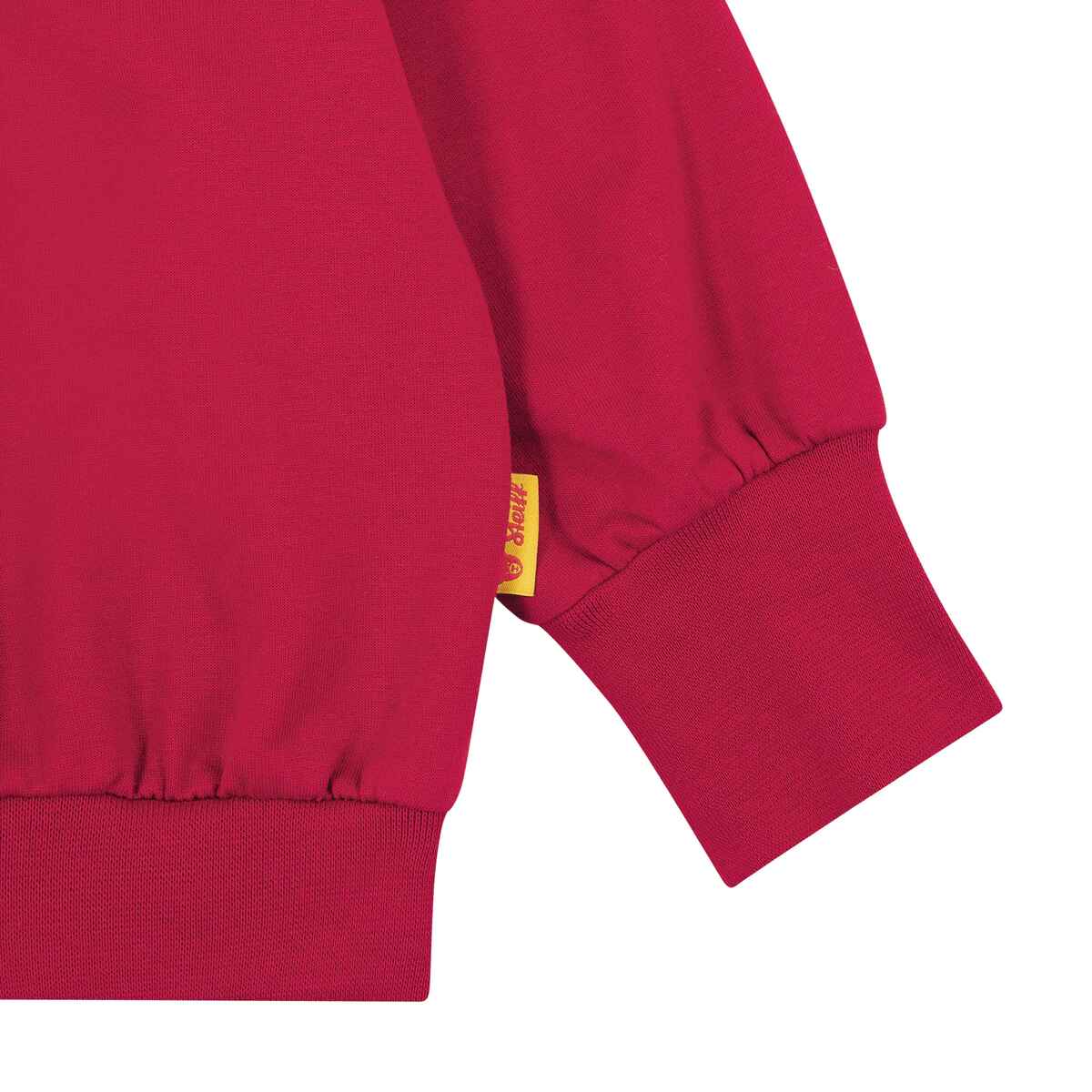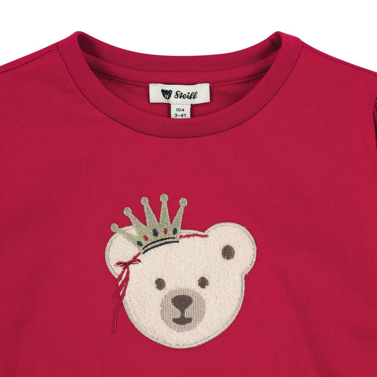 Червоний світшот Celebration створює ніжний та елегантний образ завдяки м’якому трикотажу та модним рукавам із легким об’ємом. Комфортний прямий крій у поєднанні з еластичними манжетами, коміром і нижнім еластичним краєм дарує затишок упродовж дня. Головний акцент — фірмовий ведмедик Steiff із золотистою короною, що додає образу королівського шарму. Ідеальний теплий вибір для особливих моментів та стильних прогулянок.