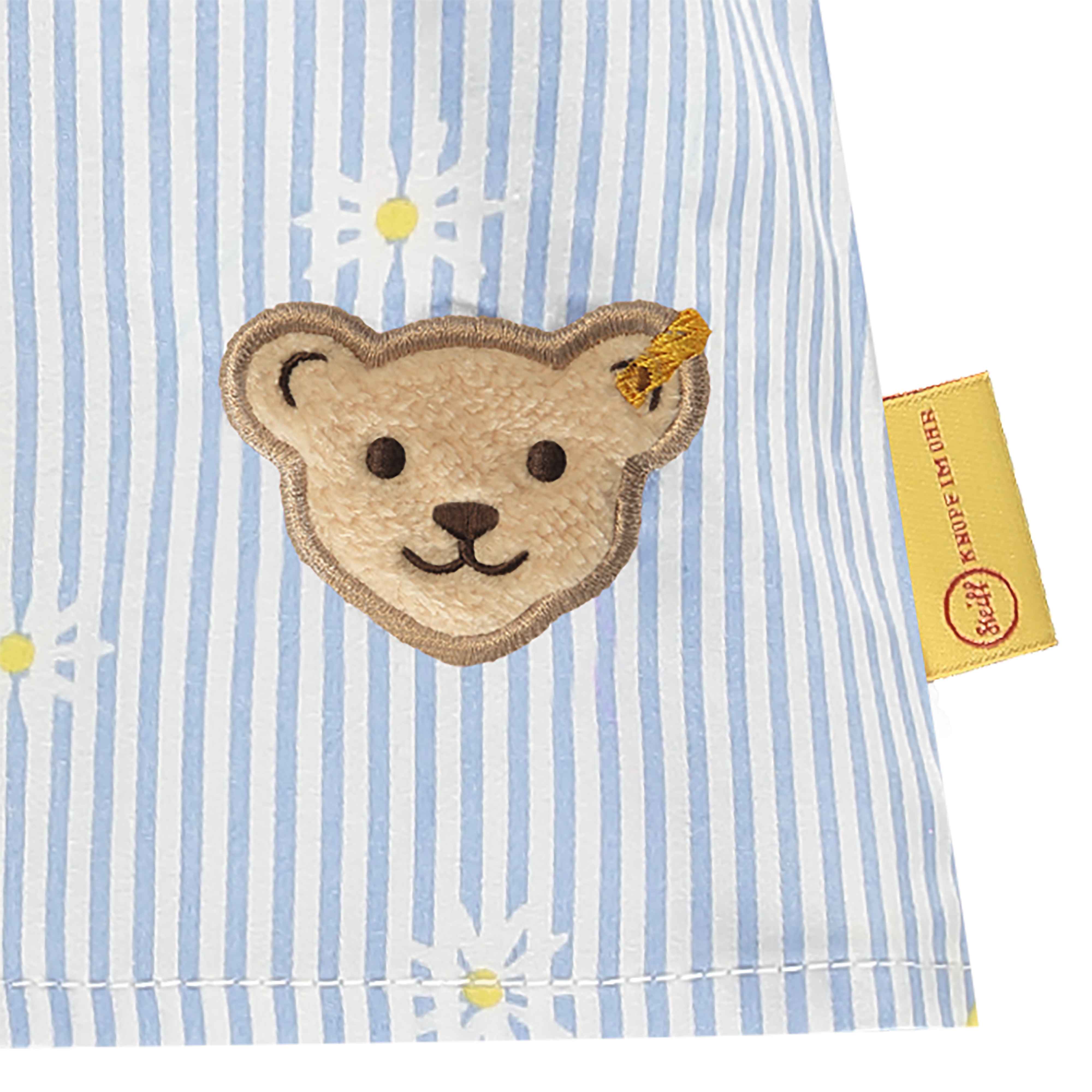 Блуза Hello Summer с яркими лимонными мотивами создана из легкого, дышащего хлопка. Мягкая ткань дарит приятные тактильные ощущения. Сертифицированный материал полностью безопасен для ребенка, не вызывает аллергических реакций. Свободный крой дополняет вертикальная складка по центру, что дарит особый комфорт. Плоские кнопки на спинке облегчают одевание. Пышные рукава и аппликация в виде пушистого мишки Steiff Teddy придают изделию особое очарование.