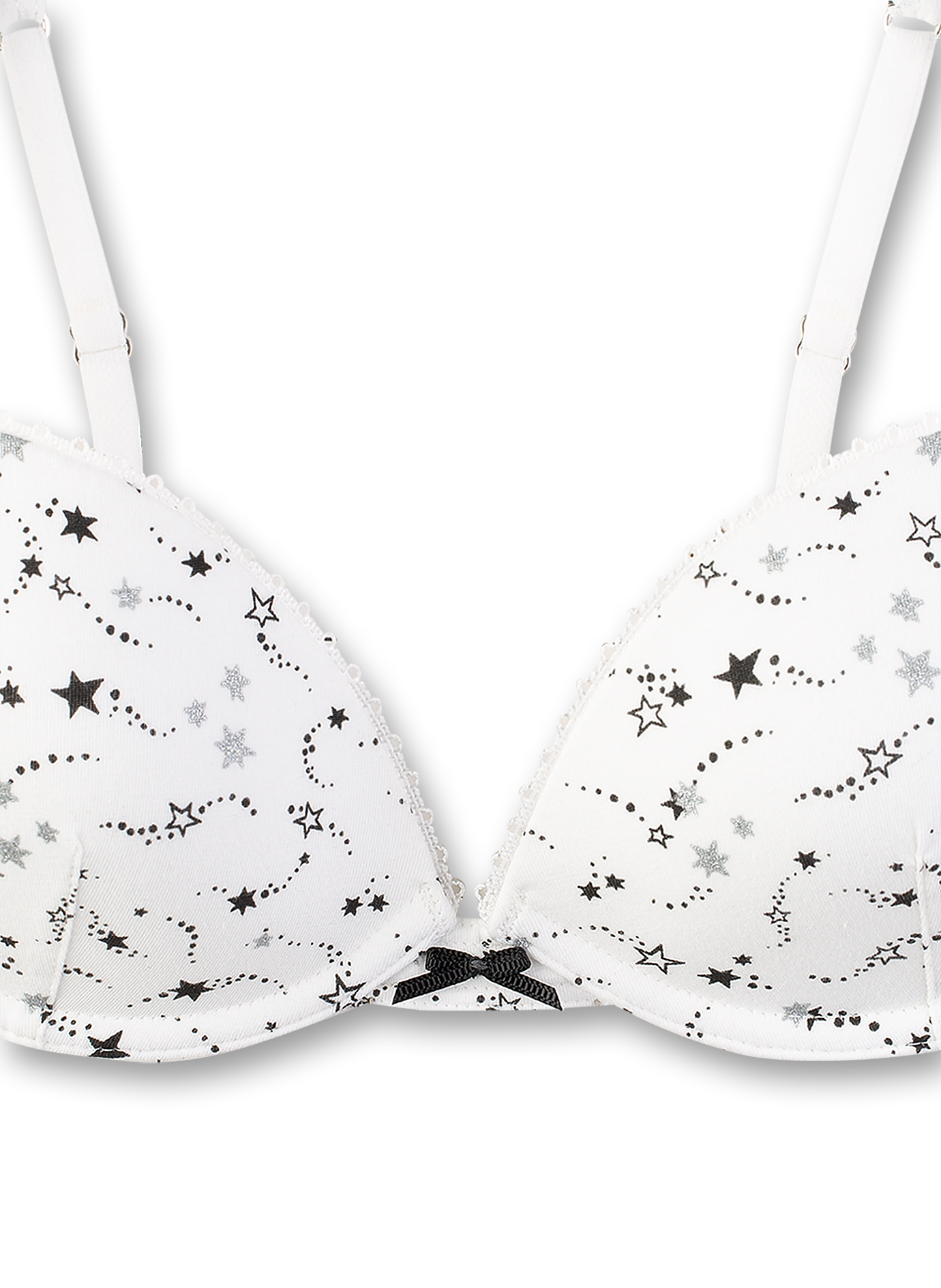 Бюстгальтер Fortune Telling — изящная премиальная модель для подростков с деликатным звёздным принтом. Благодаря уникальному составу ткани материал сочетает натуральную мягкость и практичность, хорошо пропускает воздух и комфортно прилегает к телу. Формованные чашки обеспечивают аккуратную поддержку и естественную посадку. Регулируемые бретели позволяют легко адаптировать модель под индивидуальные особенности. Качественное исполнение и продуманные детали подчёркивают премиальный уровень изделия.