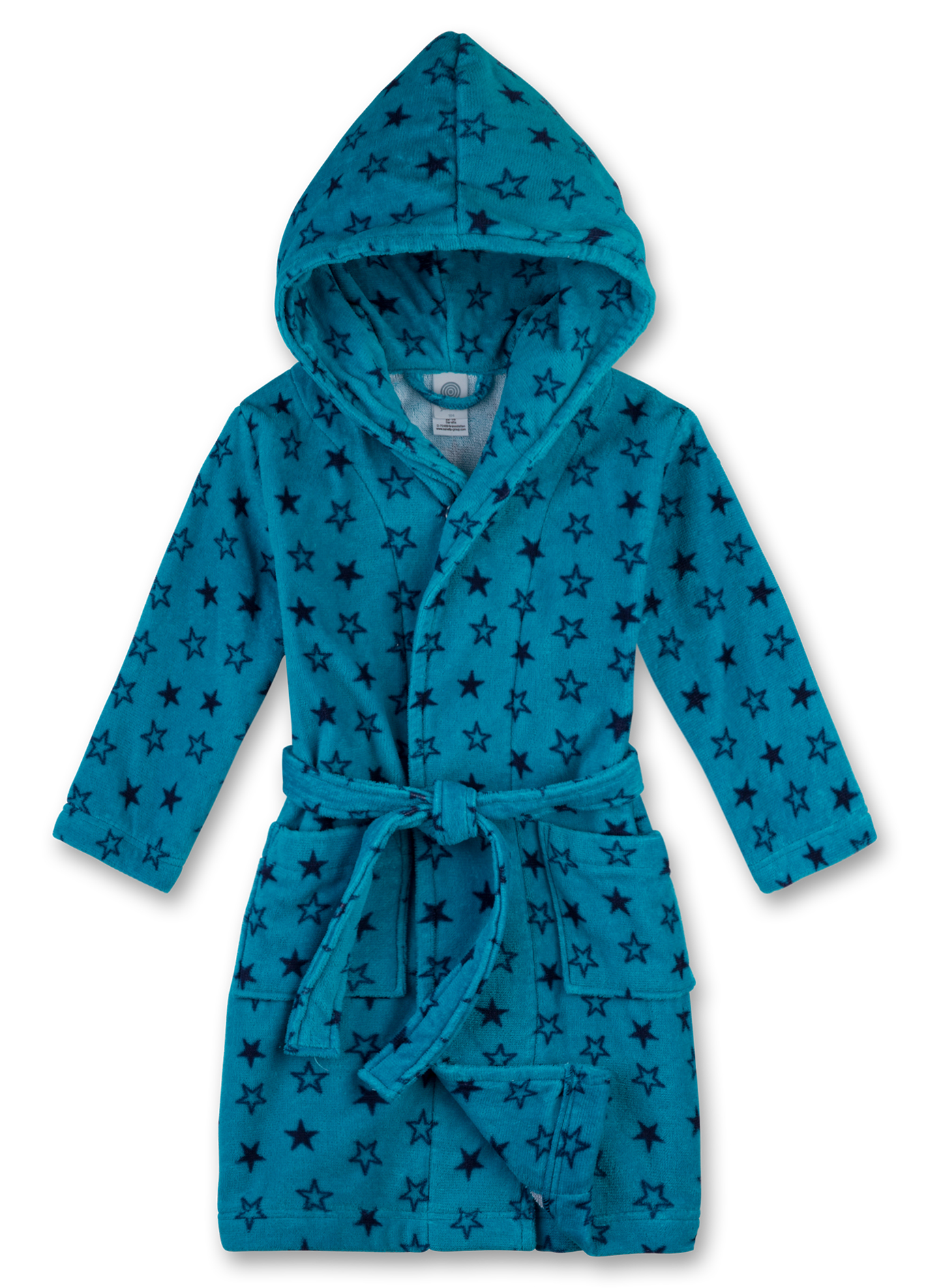 Халат для мальчика с капюшоном. Темные звезды на ярком бирюзовом фоне создают приятный дизайн. Мягкая хлопковая ткань приятна к телу, создает комфорт и уют. Фиксацию обеспечит широкий пояс. Идеален после купания или посещения бассейна.