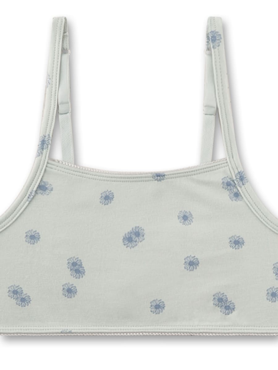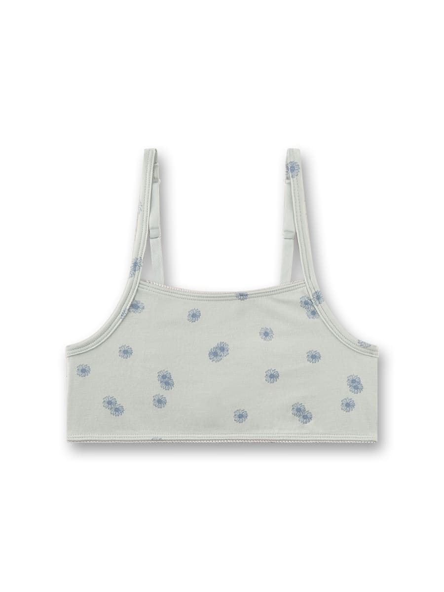 Дизайн вирізняється делікатною естетикою. Світлий відтінок доповнений дрібним квітковим принтом у ніжному блакитному кольорі. Такий візерунок створює свіжий, витончений образ. Тонкі регульовані бретелі дозволяють налаштувати посадку для максимального комфорту. Лаконічний крій формує акуратний силует, ідеально підходить для щоденного носіння.
