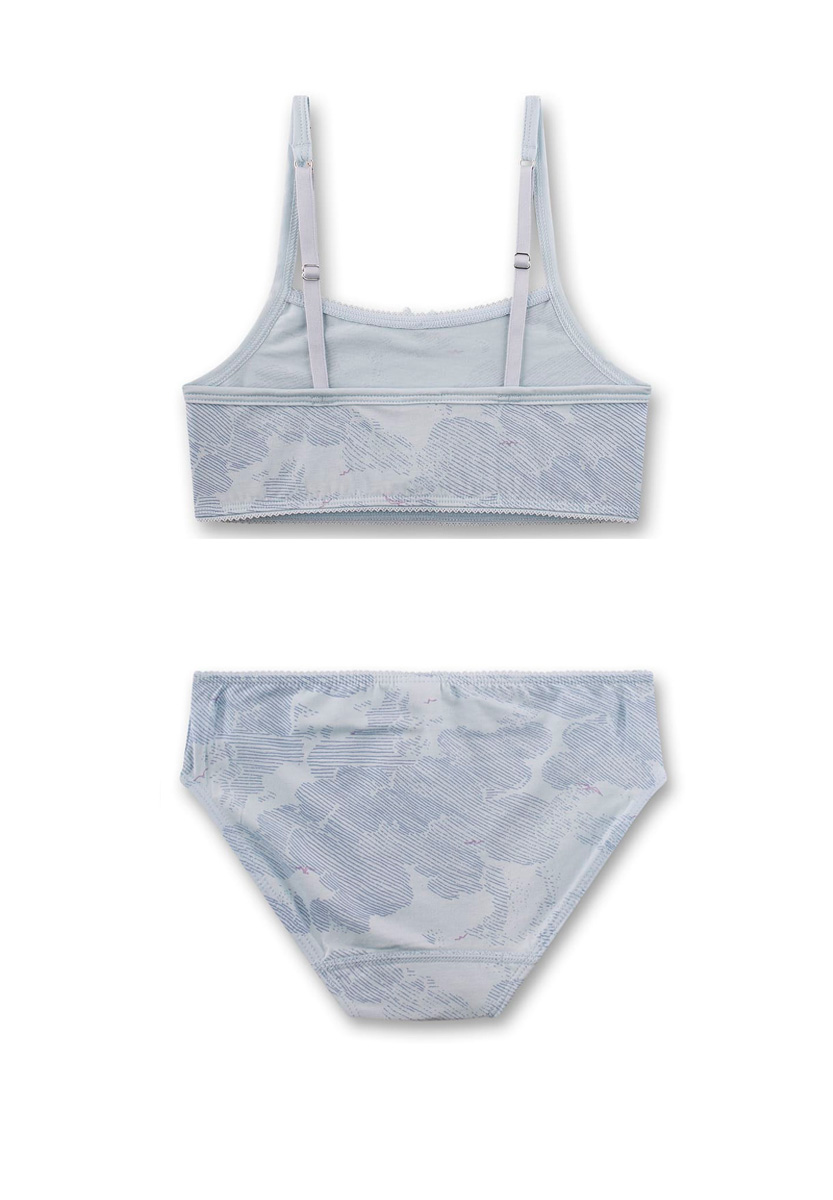 Ніжний візерунок у хмарному стилі та маленький бантик додають моделі витонченості. Топ має м’яку посадку та зручні регульовані бретелі, трусики — еластичний пояс і м’які шви, що не тиснуть. Комплект Sanetta створений для активних днів і спокійного відпочинку, даруючи відчуття легкості та свободи.