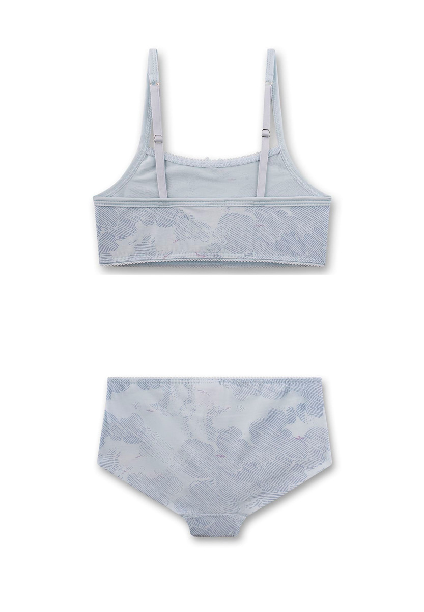 Модель прикрашена делікатним візерунком у хмарному стилі та маленькими бантиками, що додають витонченості. М’які плоскі шви не подразнюють шкіру, а еластичні бретелі забезпечують зручну посадку. Ідеальний вибір для щоденного носіння — стильний, легкий і комфортний комплект від Sanetta.