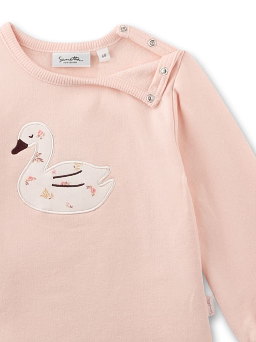 Світшот Ducks із аплікацією качечки надає образу ніжності та затишку. М’який трикотаж із бавовни з домішкою еластану приємно прилягає до тіла й не обмежує рухів. Еластичні манжети на рукавах зберігають тепло, а натуральна тканина безпечна й комфортна для чутливої дитячої шкіри. Ідеальний вибір для щоденних прогулянок і затишних днів удома.