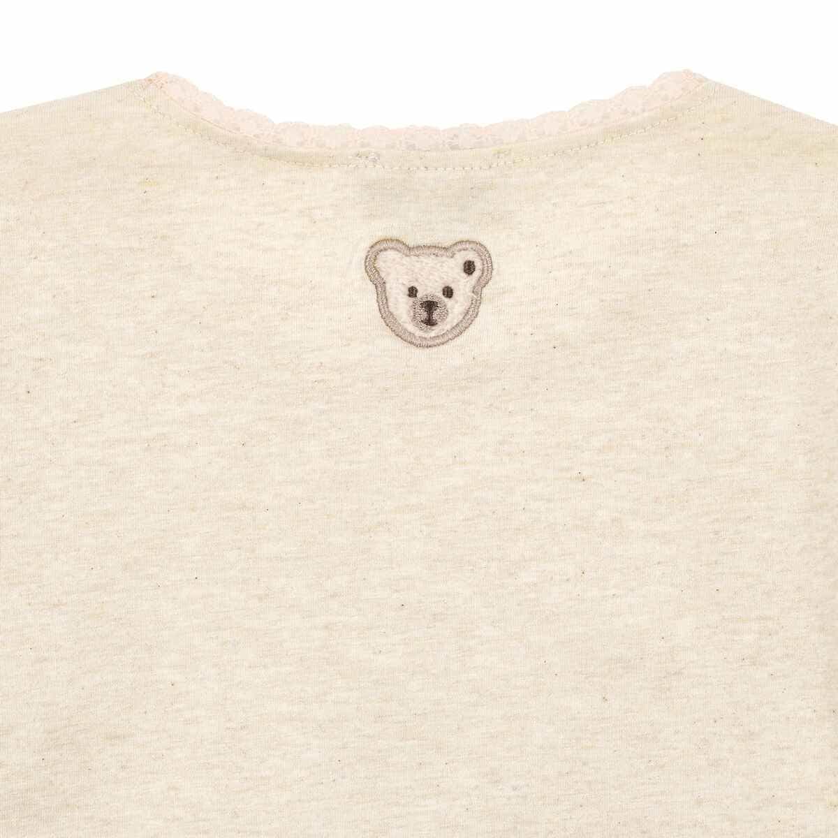 Футболка Western Core поєднує ніжність і витончений стиль, створює комфортний образ. М’яка бавовняна тканина делікатно прилягає до шкіри, добре пропускає повітря, забезпечує приємні відчуття протягом усього дня. Прямий крій дарує свободу рухів, підходить для активного ритму. Акуратна мереживна обробка горловини додає легкого шарму, витончені контрастні деталі у ніжному відтінку підкреслюють елегантність. Центральний принт із персонажем у стилі cowgirl виглядає грайливо та водночас стильно, доповнений делікатною вишивкою. Фірмовий мотив із ведмедиком на спинці завершує образ із теплим акцентом.