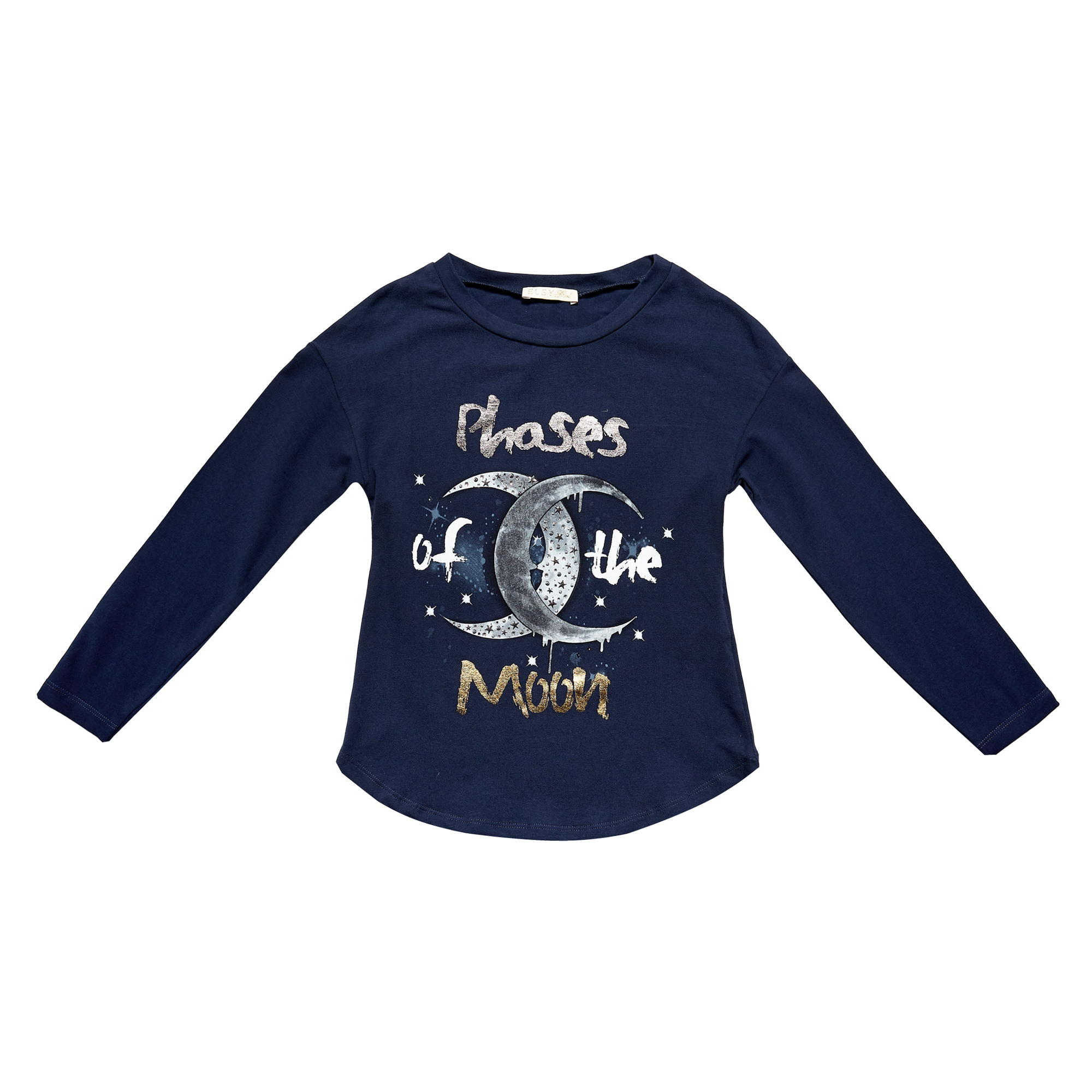 Футболка Moon привертає увагу стильним поєднанням глибокого кольору та ефектного місячного принта з металізованими деталями. М’яка еластична тканина забезпечує приємне відчуття на тілі та комфорт під час активних буднів. Довгі рукави й округлений низ додають моделі акуратного, сучасного силуету. Завдяки універсальному дизайну футболку легко поєднувати з джинсами, легінсами чи спідницями — і створювати образи з особливим космічним настроєм.