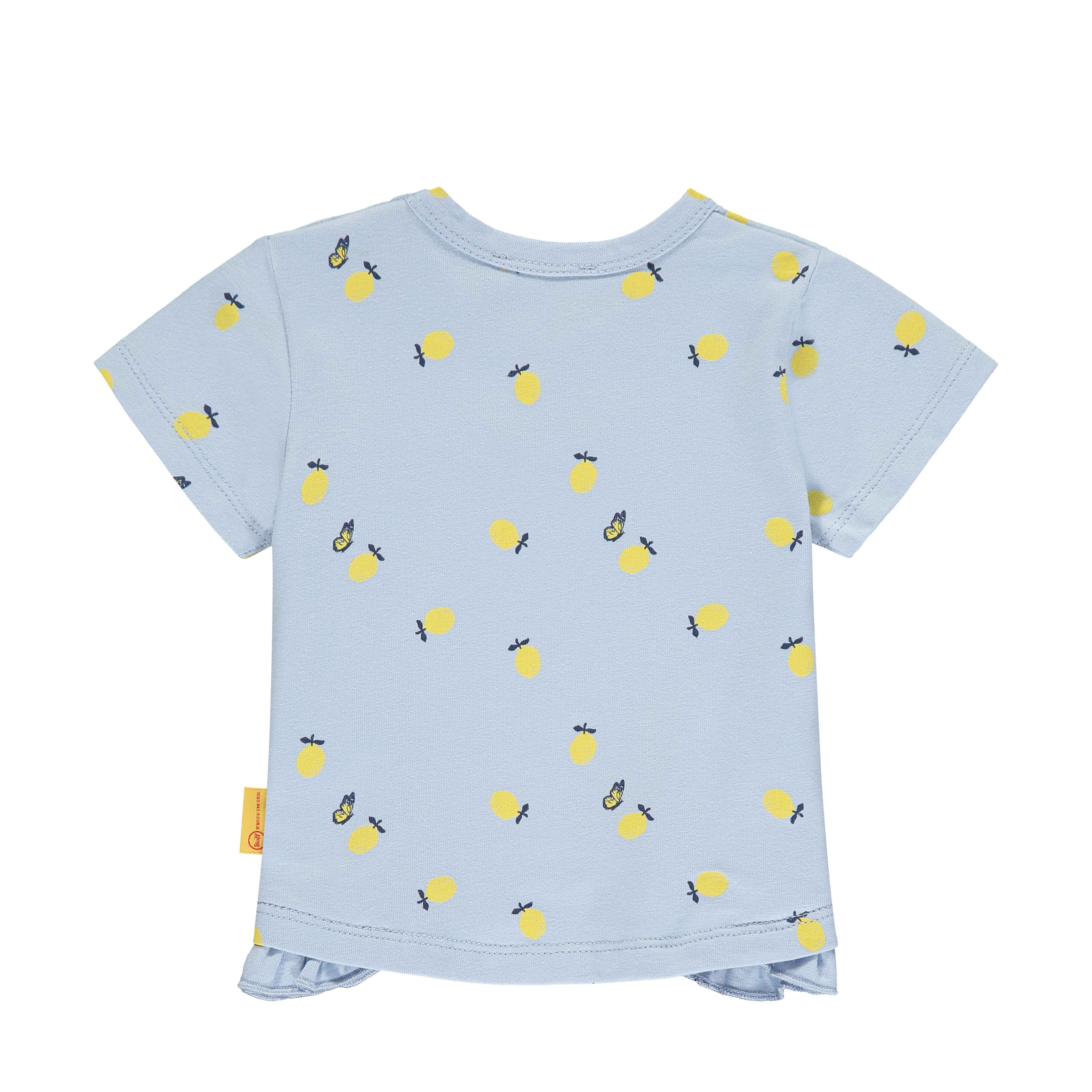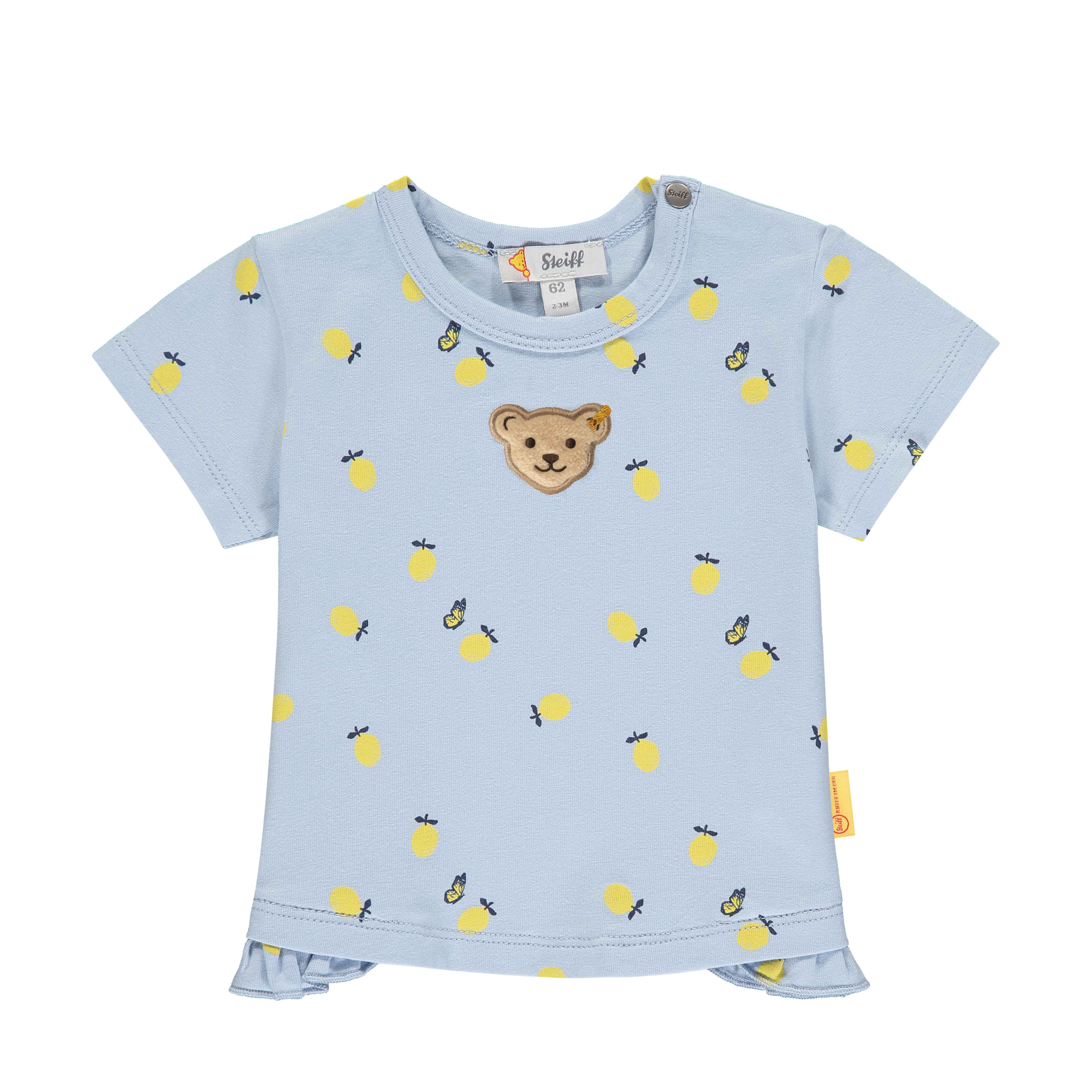 Неймовірно мила футболка Hello Summer прикрашена принтом з яскравими лимонами та метеликами. Виготовлена з м'якого, бавовняного трикотажу для виняткового комфорту. Сертифікований матеріал повністю безпечний, не викликає алергічних реакцій. Бічні вставки з рюшами надають моделі особливої чарівності. Кнопки на плечі полегшують одягання. Еластична тканина і вільний крій дарують повноцінну свободу рухів. Пухнастий ведмедик Steiff Teddy доповнює дизайн виробу