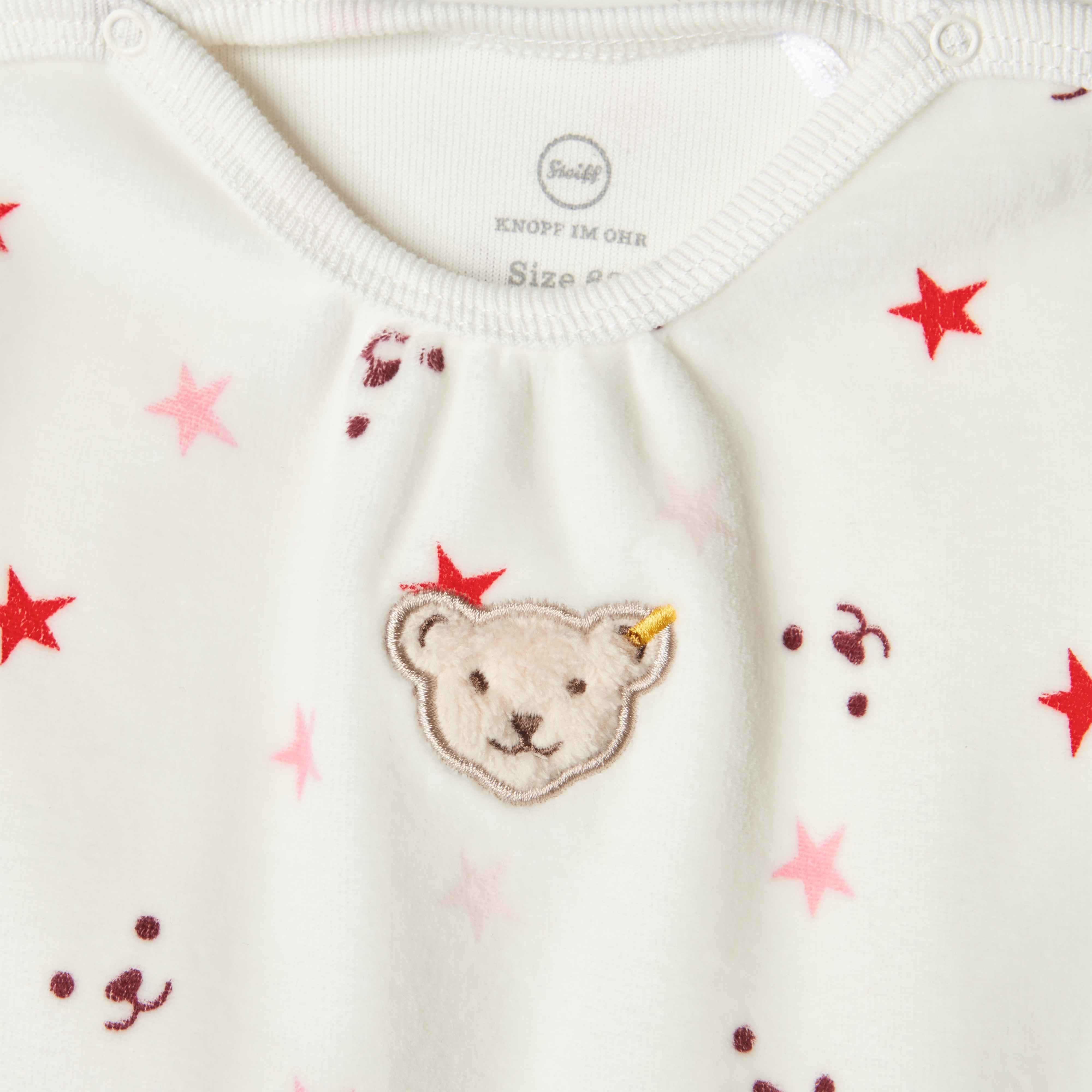 Затишний комбінезон-сліп Wellness з органічного велюру на бавовняній основі - ідеальне поєднання ніжності та комфорту для малюків. Матеріал, створений з екологічно чистих компонентів, гарантує максимальну безпеку для чутливої шкіри малюка. Кнопки на горловині та ніжках роблять процес одягання простим і швидким, не викликаючи дискомфорту під час контакту зі шкірою. Забарвлення з чарівними мордочками ведмедика і зірочками додає виробу грайливий елемент.
