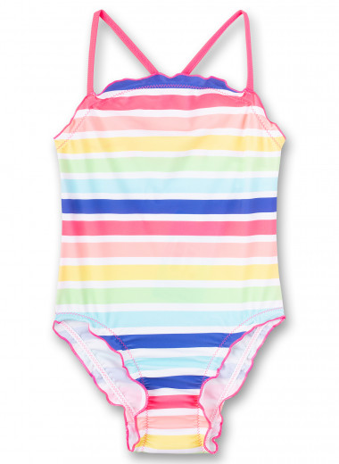 Суцільний купальник у різнокольорову смужку виглядає яскраво та по-літньому свіжо. Тонкі бретелі й делікатні хвилясті краї додають образу легкості та грайливості. Модель комфортно прилягає до тіла та не сковує рухів під час плавання. Чудовий вибір для відпочинку на пляжі чи в басейні.