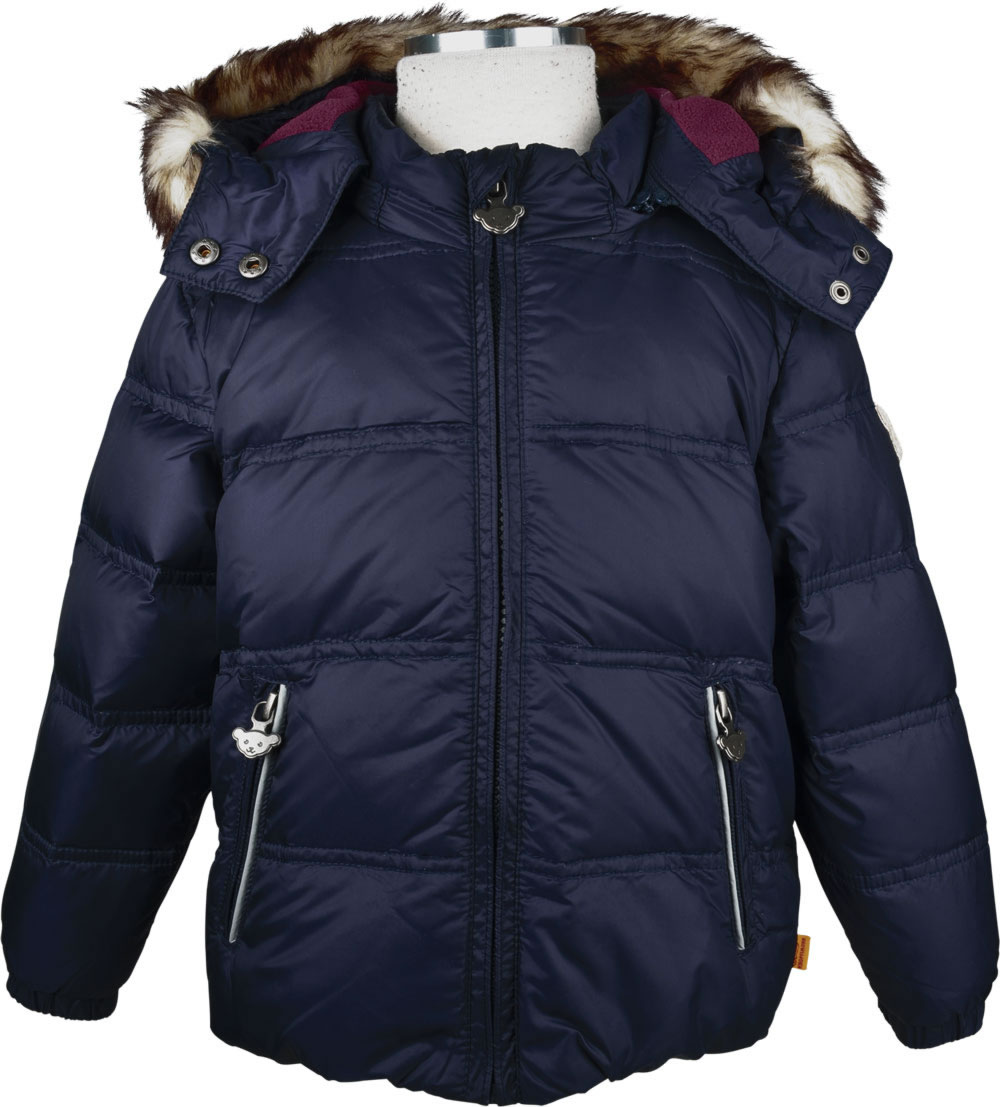 Стьобаний анорак з капюшоном на блискавці для хлопчиків. Капюшон оснащений м'якою флісовою підкладкою. Всередині куртка має теплу підкладку з флісу. На рукавах гумові манжети. На блискавці - маленький ведмедик як підвіска. Імітація хутра на капюшоні може бути знімною