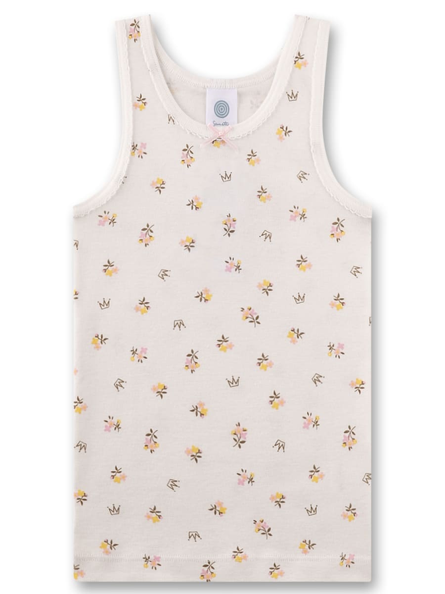 Майка Small bouquets — витончена базова річ для дівчинки, прикрашена ніжним принтом маленьких квітів і корон, що створює легкий та чарівний образ. Модель виготовлена з органічної бавовни, яка відзначається м’якістю, добре пропускає повітря та дарує комфортні відчуття протягом усього дня. Акуратна обробка країв, приємна до тіла тканина та зручний крій забезпечують свободу рухів і комфортну посадку. Маленький декоративний бантик на вирізі додає образу особливої ніжності та робить майку чудовим вибором для щоденного носіння. Матеріал сертифікований незалежними європейськими інститутами Organic Cotton, безпечний до здоров'я дитини, вільний від шкідливих сполучень.