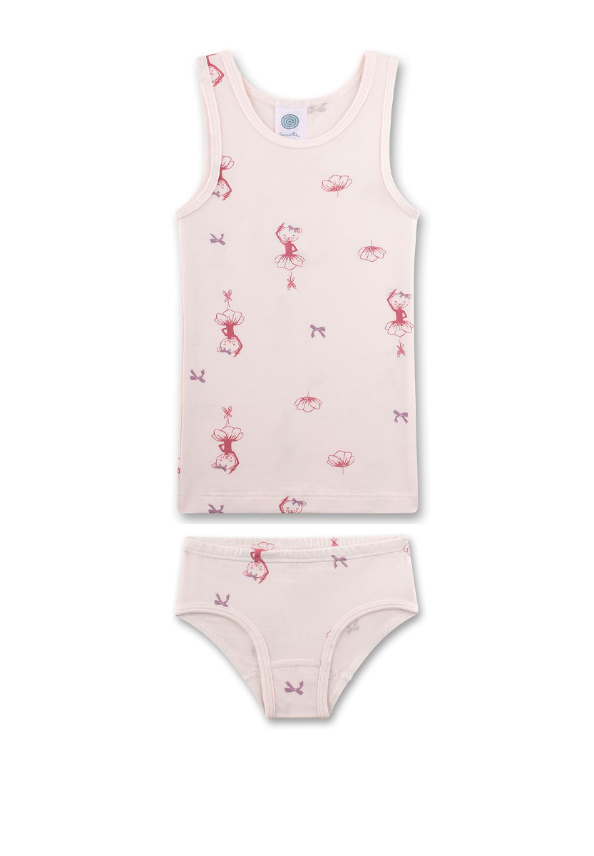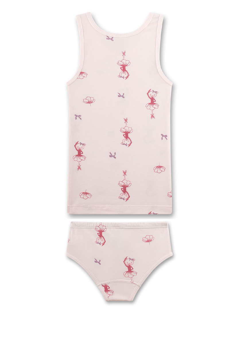 Ніжний комплект Ballerina у світло-рожевому кольорі створений для максимального комфорту та приємних щоденних моментів. Майка прикрашена чарівним принтом і виконана з високоякісної еластичної суміші бавовни та модалу. М’який матеріал дарує приємні тактильні відчуття, чудово пропускає повітря та не подразнює чутливу шкіру. Прямий облягаючий крій та округлий виріз забезпечують ідеальну посадку, немов друга шкіра. Тканина проста у догляді й підходить для машинного сушіння.