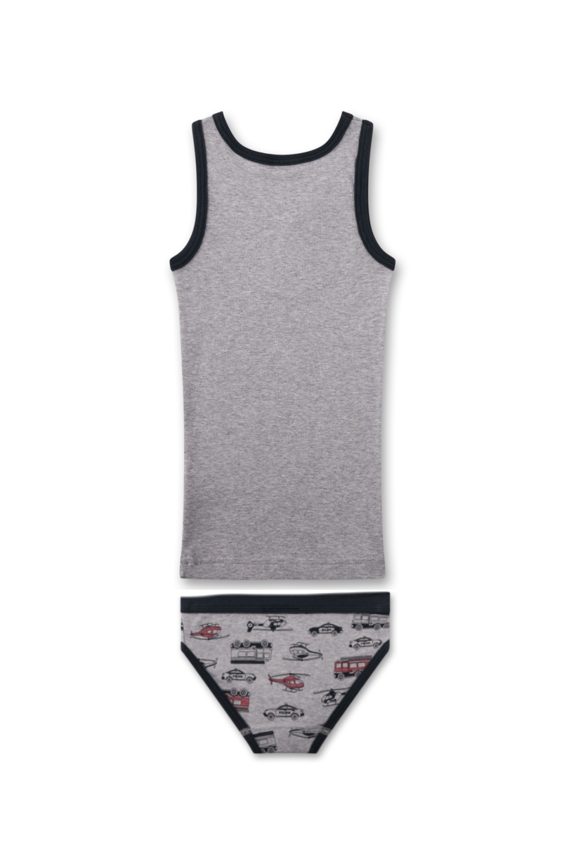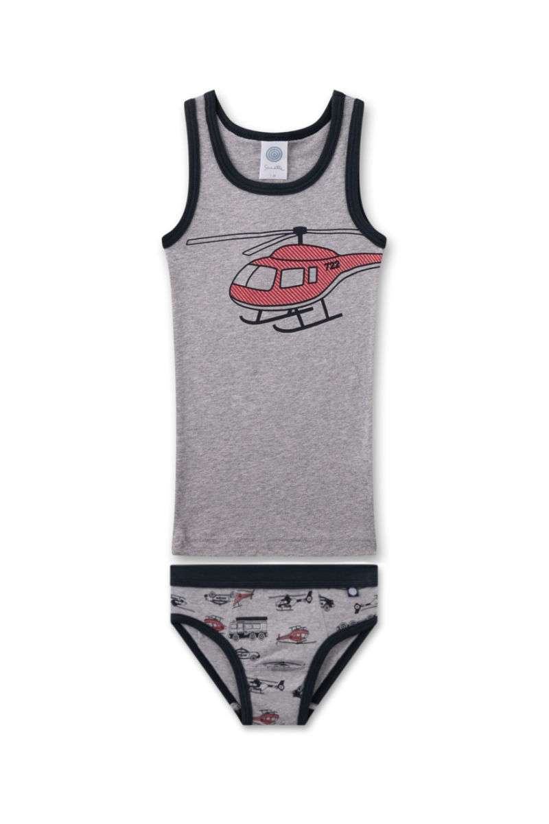 Комплект складається з майки та трусів, виконаних у гармонійному дизайні. Майка сірого кольору прикрашена яскравим принтом із гелікоптером, що додає образу динамічного настрою. Труси оздоблені веселим малюнком із різними транспортними засобами, який робить модель ще цікавішою.