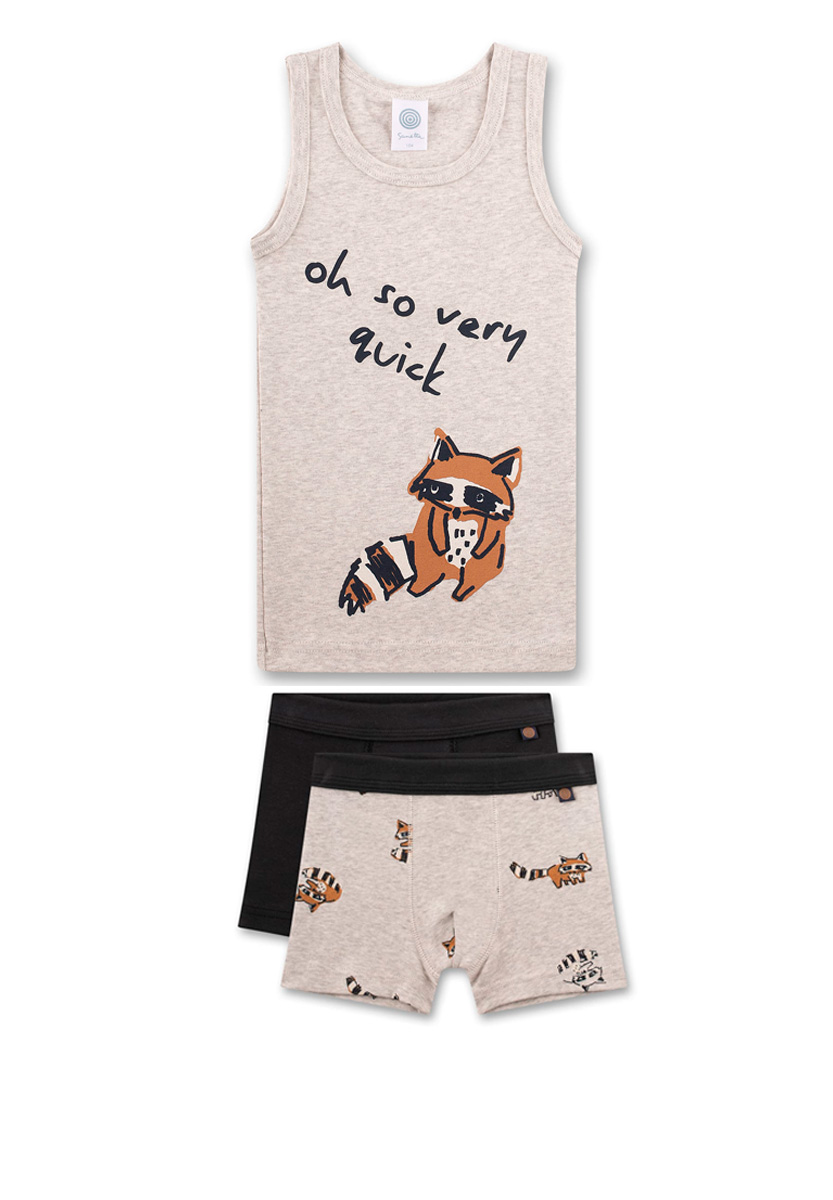 Комплект Raccoon — це зручний та веселий вибір для кожного дня. У набір входить майка з милим єнотом і написом “oh so very quick” та дві пари трусиків-боксерів — однотонні й з кумедним принтом у тон.