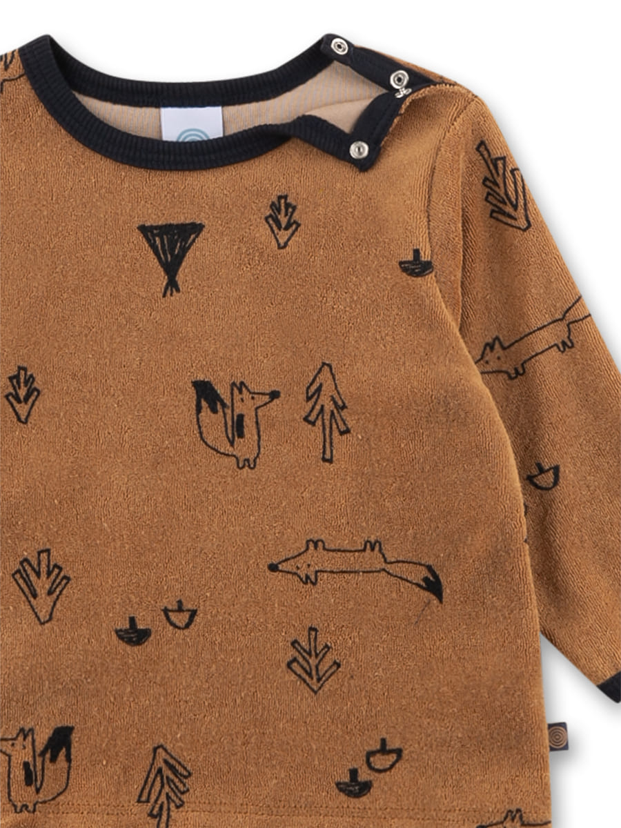 Піжама Foxes у теплому коричневому кольорі дарує малюкам затишок і тепло під час сну. М’який махровий матеріал ніжно торкається делікатної дитячої шкіри, забезпечуючи комфорт і приємні відчуття. Грайливий принт із лисичками та лісовими мотивами робить комплект чарівним і стильним. Штанці з комфортним поясом і кофточка із застібкою на плечі забезпечують зручність під час перевдягання та ідеальну посадку.