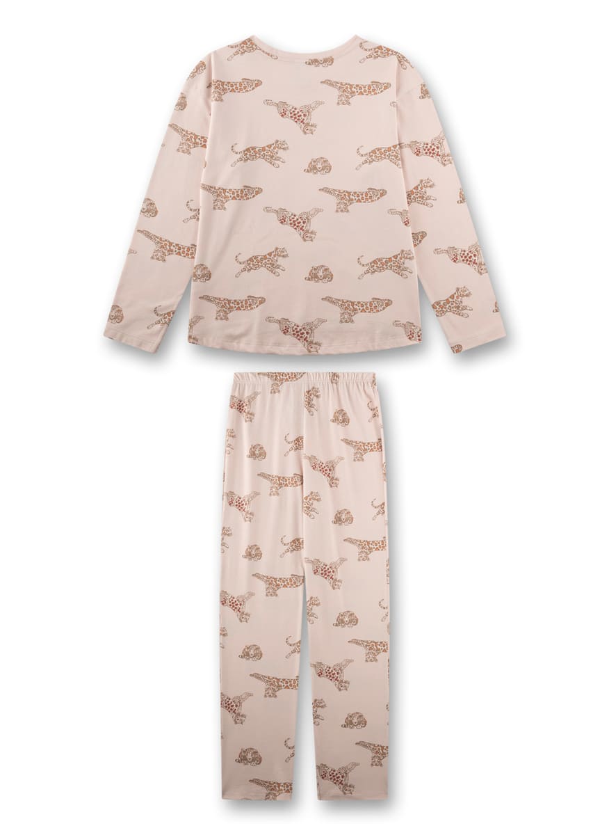 Піжама Flying Tiger — комплект для дівчинки із витонченим анімалістичним принтом для стильного домашнього образу. М’який відтінок рожево-бежевого з трендовим принтом у вигляді тигрів надає модного акценту, зберігаючи ніжність та елегантність. Лонгслів із комфортною посадкою та довгі штани з еластичним поясом забезпечують свободу рухів і зручність протягом усього дня. Виготовлена з натуральної високоякісної бавовни, тканина приємна до тіла, дихаюча та ідеально підходить для затишних ночей і домашнього відпочинку.