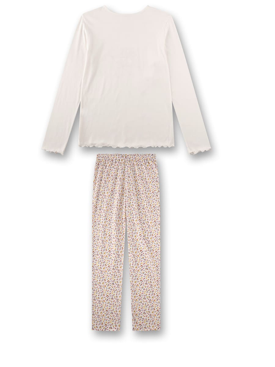 Піжама Small Flowers — ніжний комплект для дівчаток, що поєднує комфорт і витончений квітковий дизайн. Модель виготовлена з м’якого та приємного до тіла трикотажу з бавовни та модалу, який добре пропускає повітря, делікатно торкається шкіри та забезпечує комфорт під час сну. Лонгслів світлого відтінку має класичний круглий виріз, прикрашений витонченим малюнком квітів, хвилясті краї на рукавах і подолі додають образу ніжності. Штани з барвистим квітковим принтом і еластичним поясом забезпечують зручну посадку та свободу рухів.