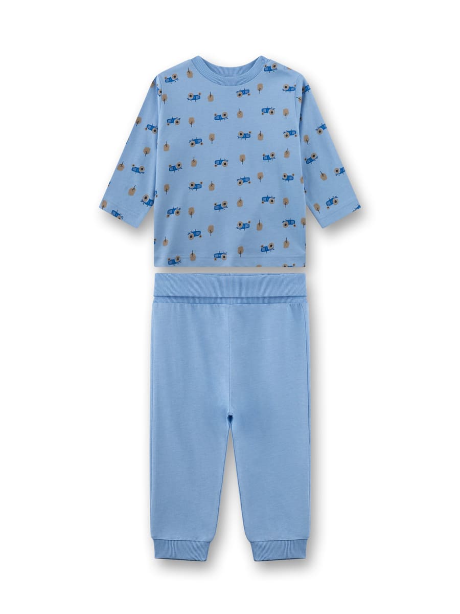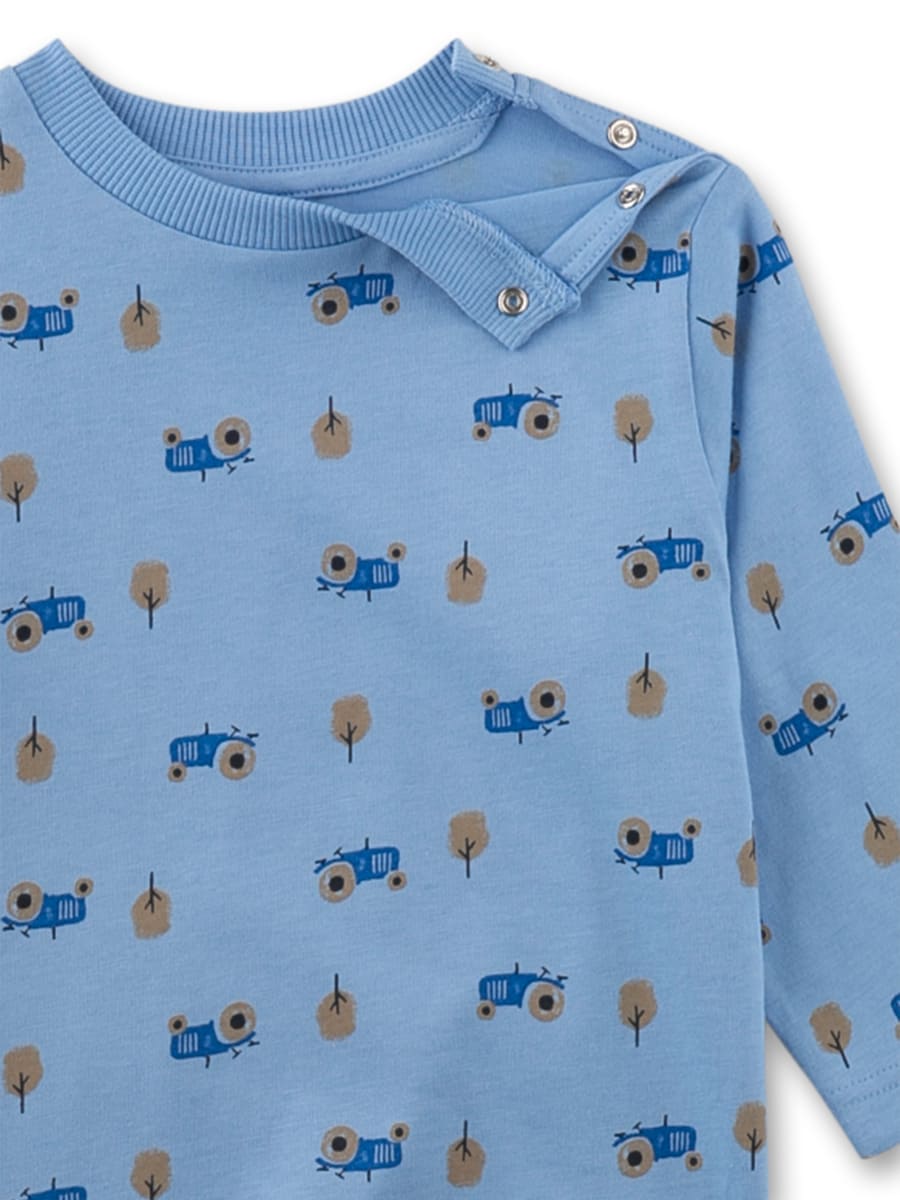 Піжама Blue Tractor — затишний комплект для малюків із милим принтом тракторців у ніжних блакитних відтінках. Виготовлений з органічної бавовни, сертифікованої за стандартом GOTS та протестованої відповідно до Oeko-Tex Standard 100, тканина особливо м’яка, дихаюча й безпечна для ніжної дитячої шкіри. Лонгслів прикрашений чарівним візерунком із маленькими тракторами та деревцями, однотонні штанці гармонійно доповнюють образ. Манжети на рукавах і штанинах забезпечують зручну посадку та свободу рухів під час сну й активних ігор. Практичний у догляді комплект, який можна сушити в сушильній машині.